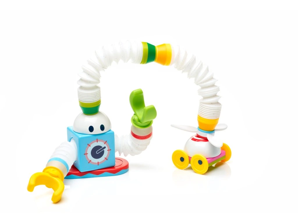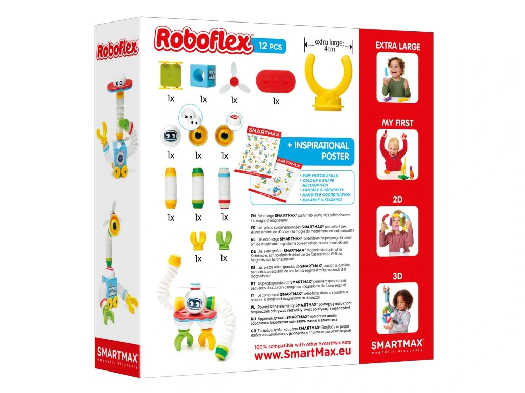 Kdo říká, že roboti musí být nehybní? S Roboflex od SmartMax se děti pustí do stavění zábavných, pružných a bláznivých robotů! Stačí si vybrat magnetické dílky, ohnout je, natáhnout a propojit – a jedinečný robot je na světě. Flexibilní a roztažitelné magnetické tyčky dávají stavebnici úplně nový rozměr a prostor pro kreativní hru.