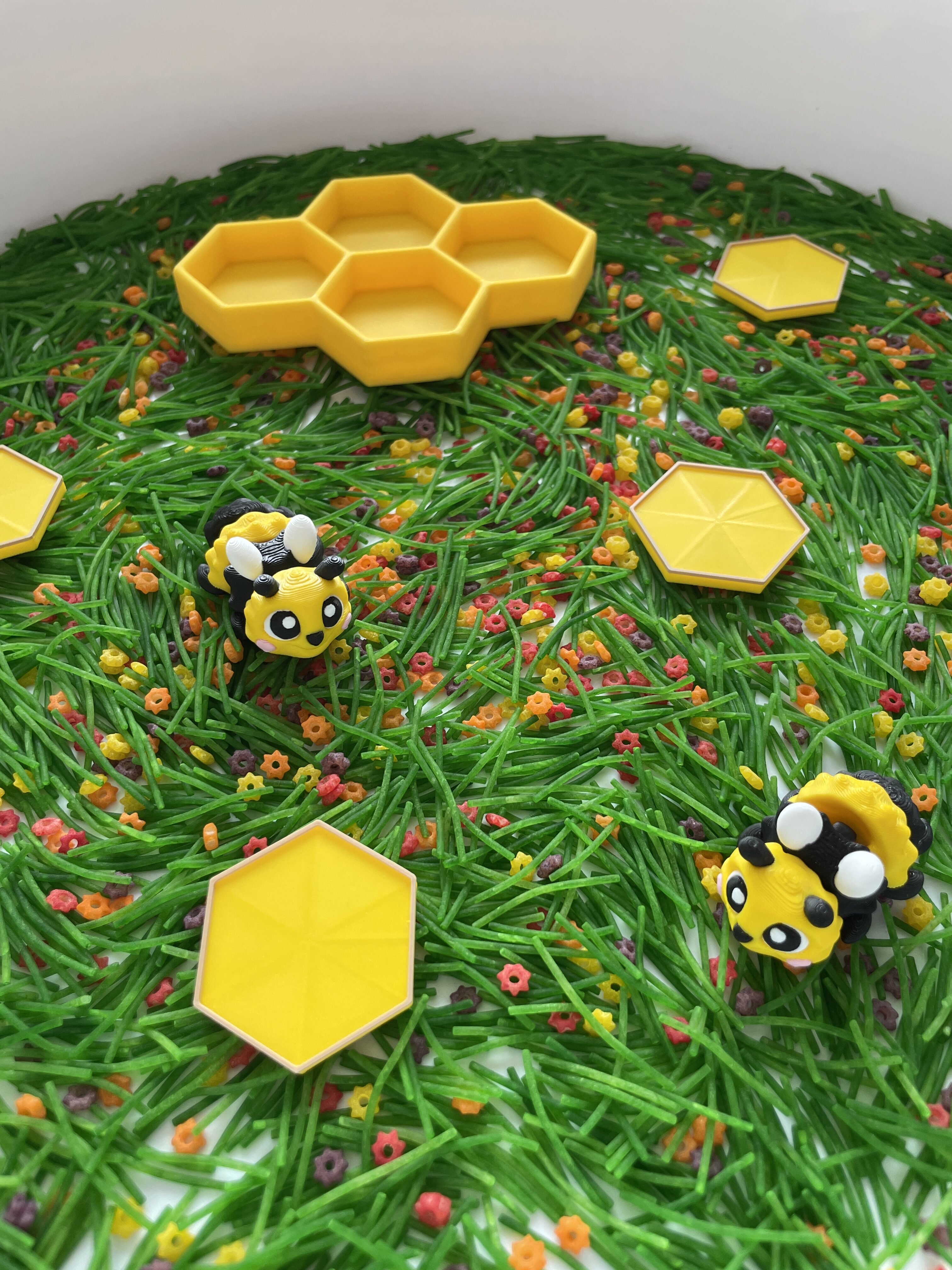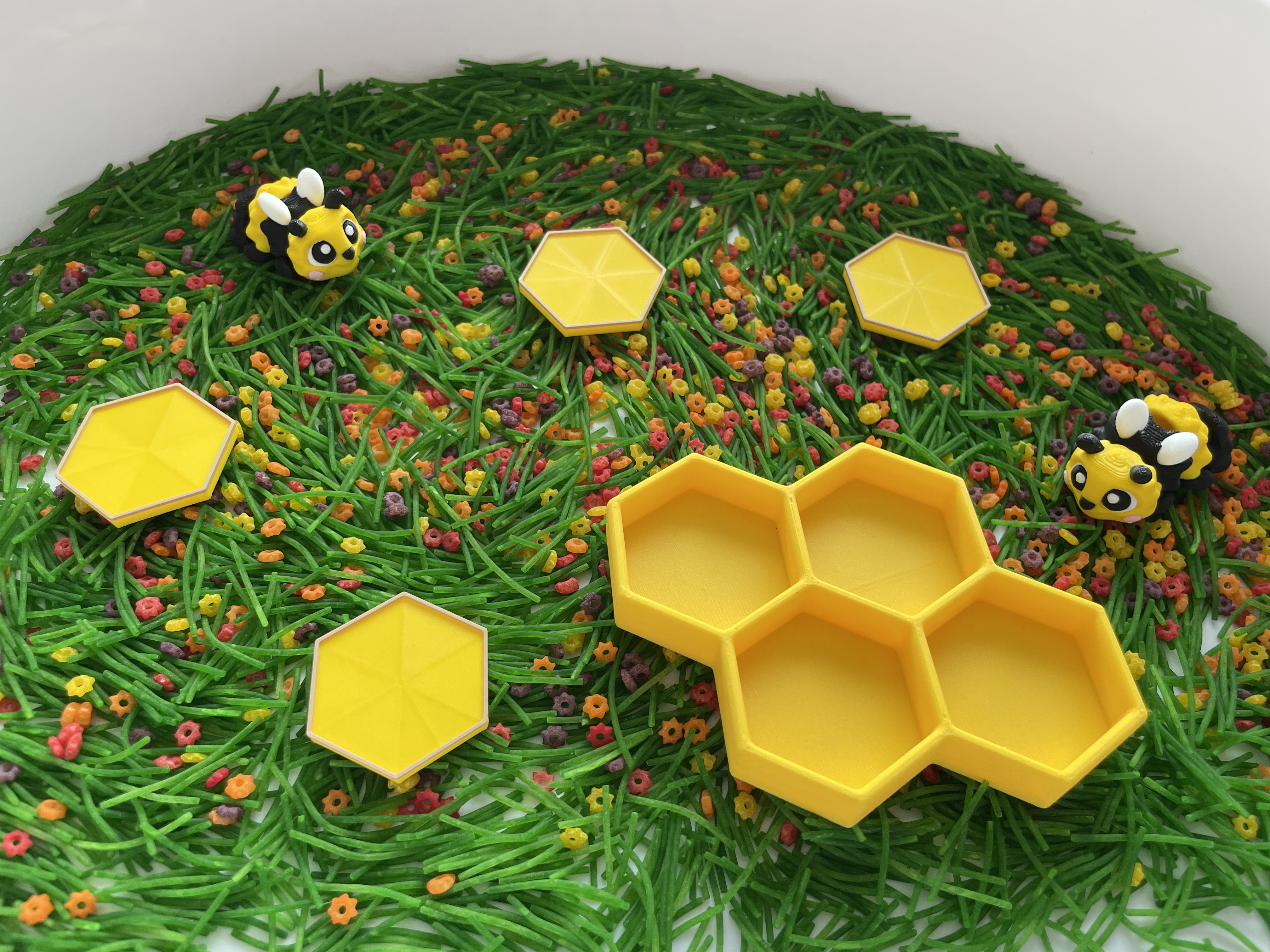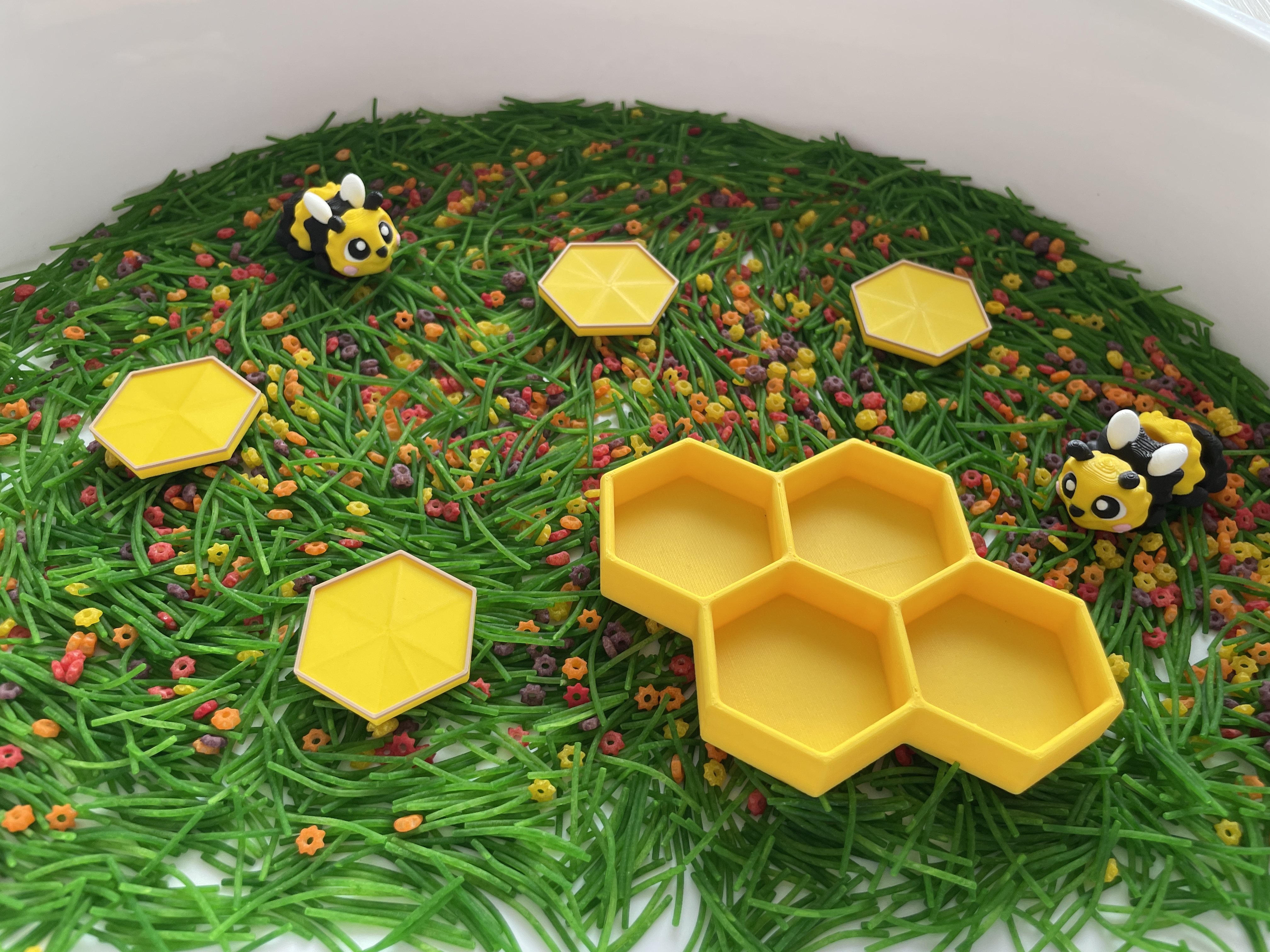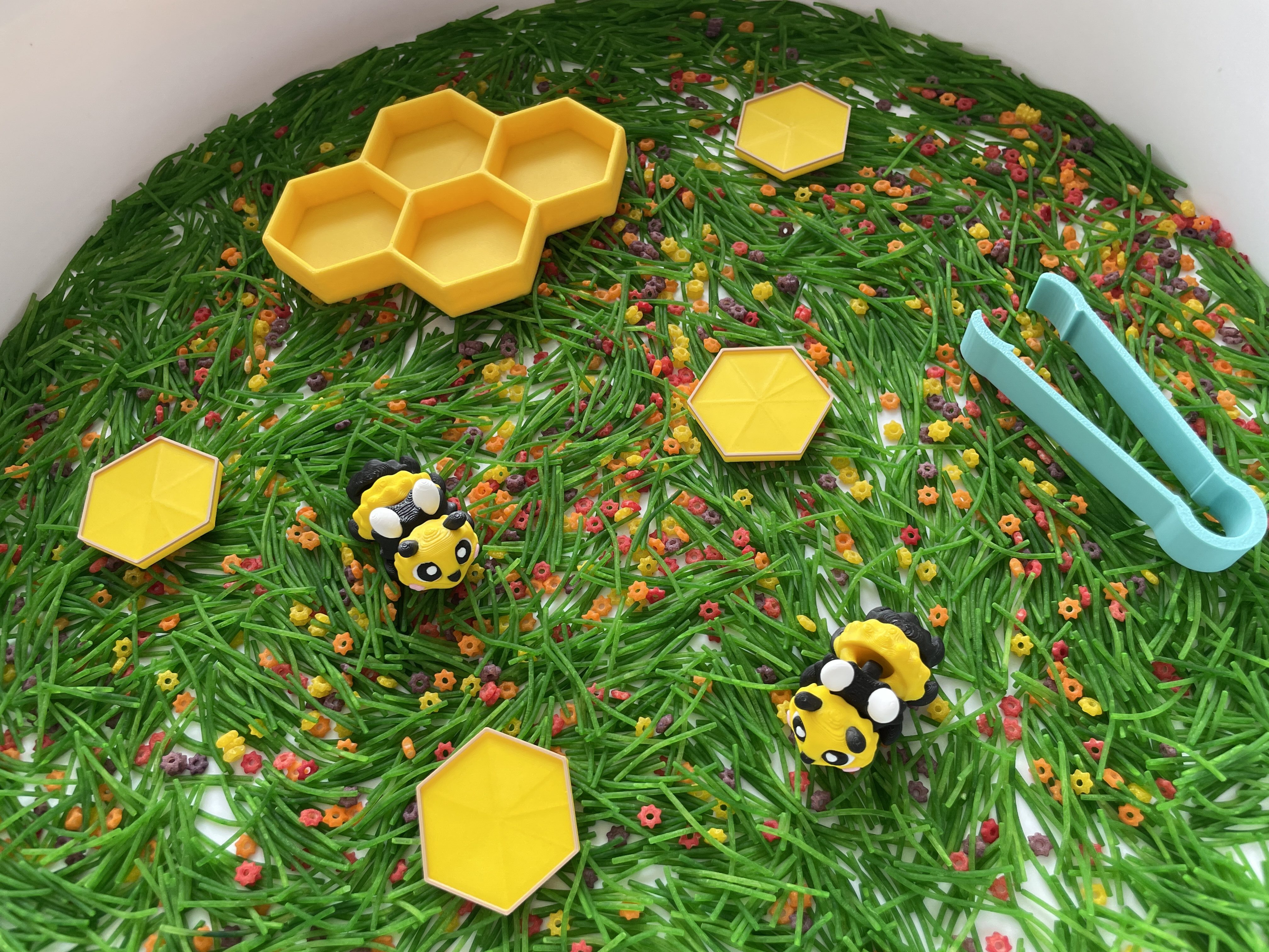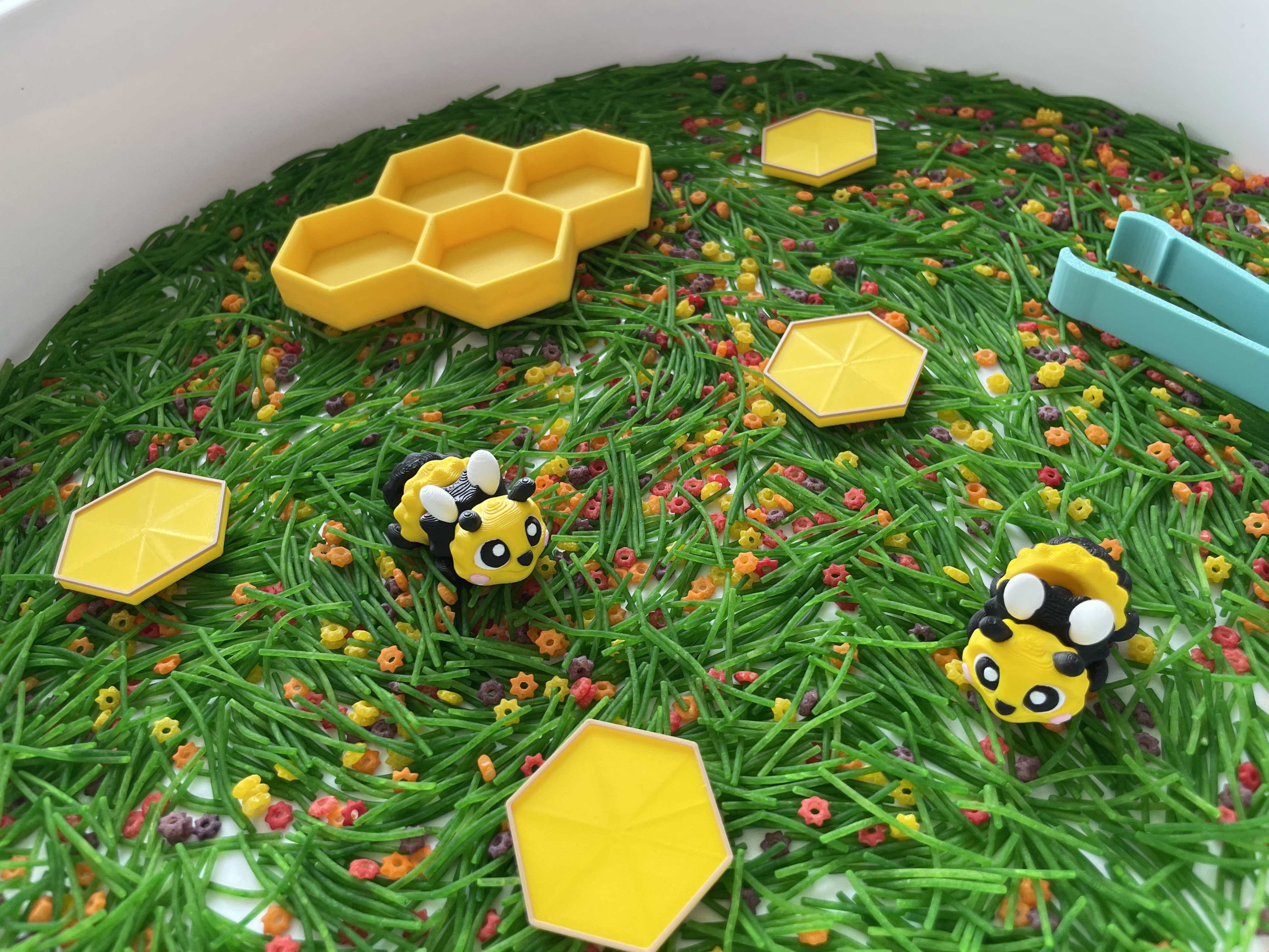 - Hmat (nabírání / vysypávání těstovin, hledání skrytých předmětů, úchop předmětů – těstoviny, květinky, včely; různé struktury materiálů – těstoviny, květiny, včely, plástve, …)