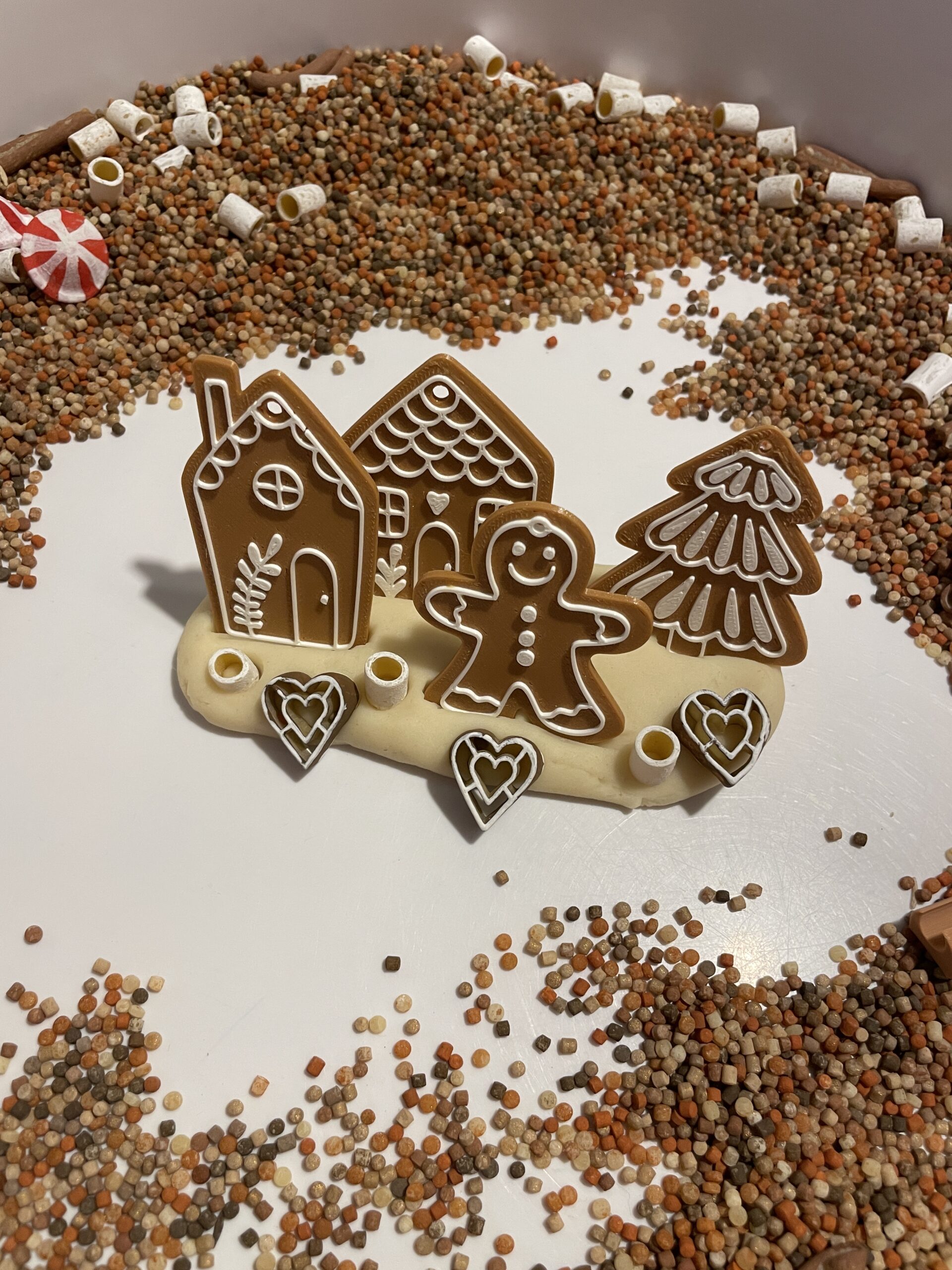 V tubě najdete 500ml (cca 400g) barevného senzorického materiálu Vánoční mlsání. Nechybí 3D doplňky z tisku – perníčkové městečko, mini vysypávací tácek perníček, hrneček, šlehačka a skořice.