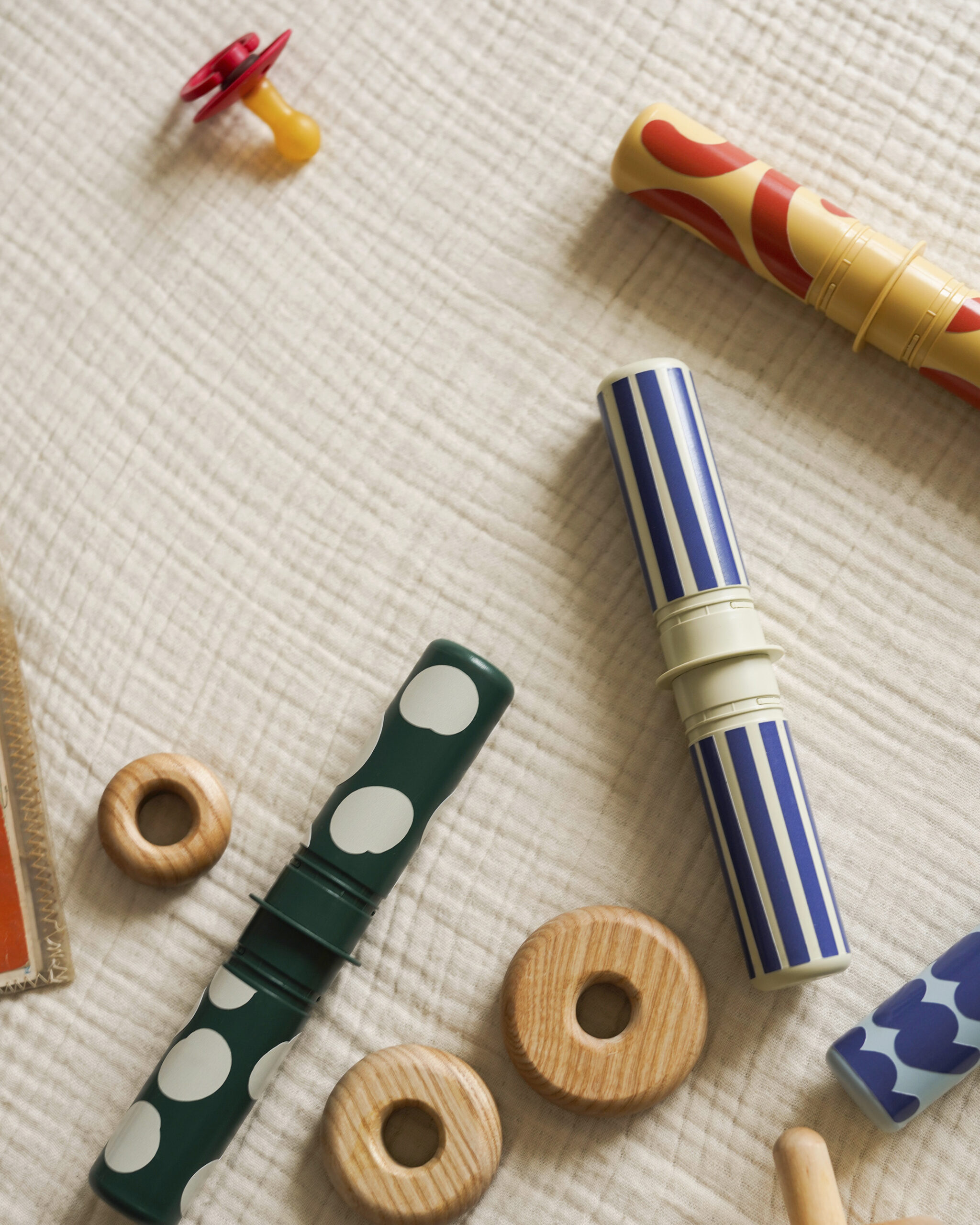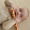- Smyslová stimulace: Chrastící kolíky s různými zvuky a vzory zaujmou pozornost dítěte a podpoří zkoumání.