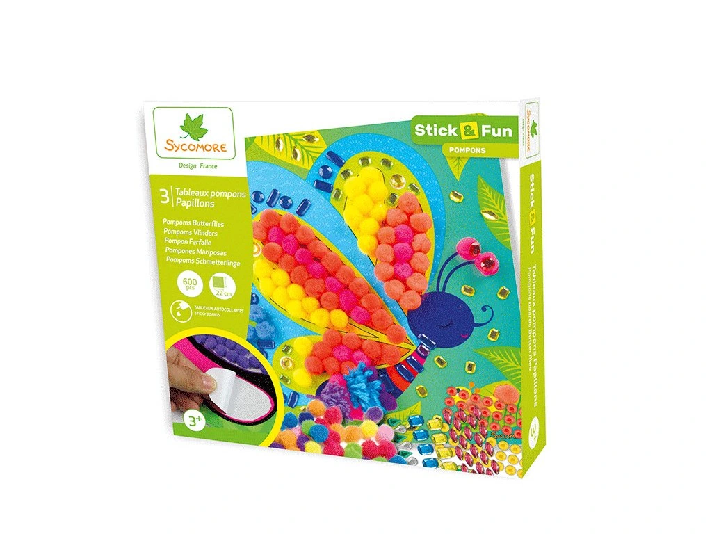 Tato hravá kreativní sada je vhodná pro děti od 3 let. Děti mohou ozdobit tři obrázky s motivy motýlů bambulkami a vytvořit tak nádherné, barevné obrázky s 3D efektem. Hotové výtvory lze snadno zavěsit díky přiloženým závěsům a krásně je vystavit v dětském pokojíčku. Při tvoření si děti procvičí rozpoznávání barev a tvarů, jemnou motoriku i koordinaci oko–ruka.