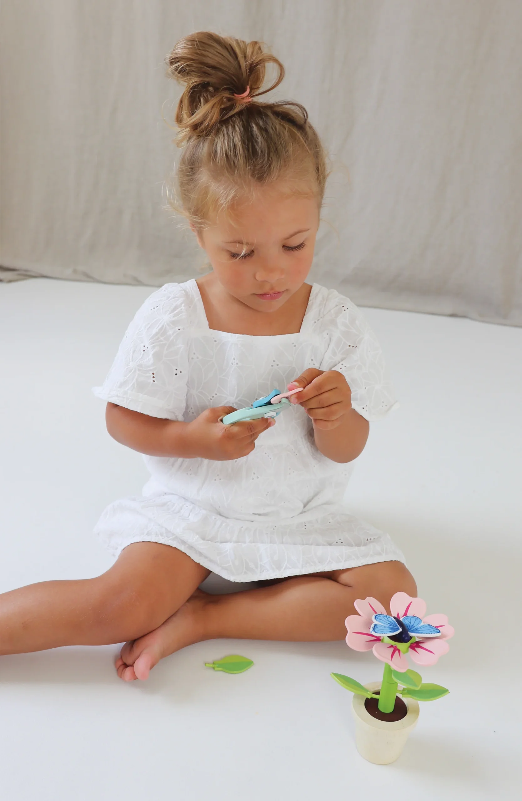 Vytvořte si vlastní květinový koutek! Tato nádherná sada obsahuje dřevěný květináč, snímatelné listy a okvětní lístky, pružný stonek a kouzelně laděného motýlka. Děti si mohou „zasadit“, skládat a aranžovat květ podle vlastní fantazie.