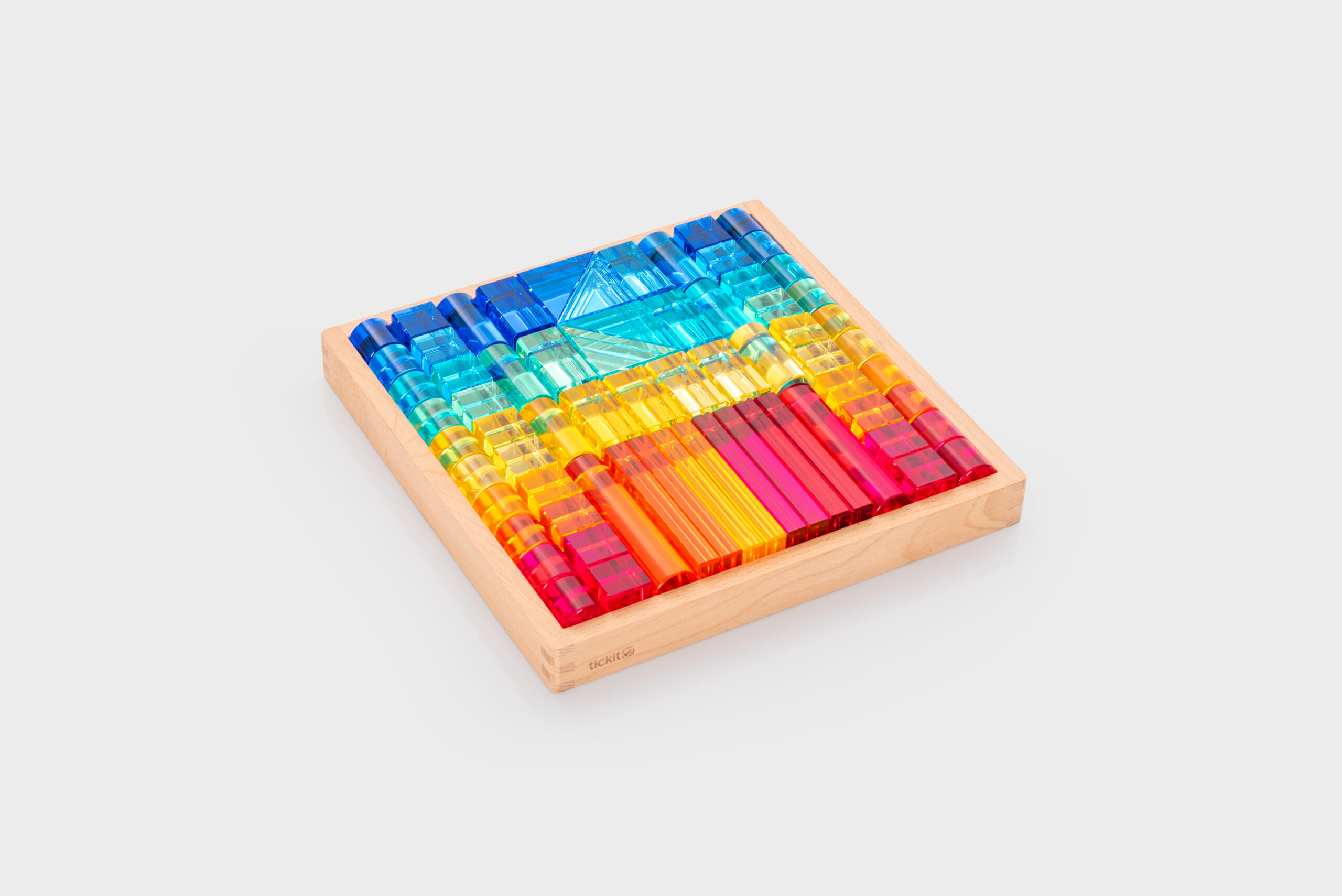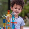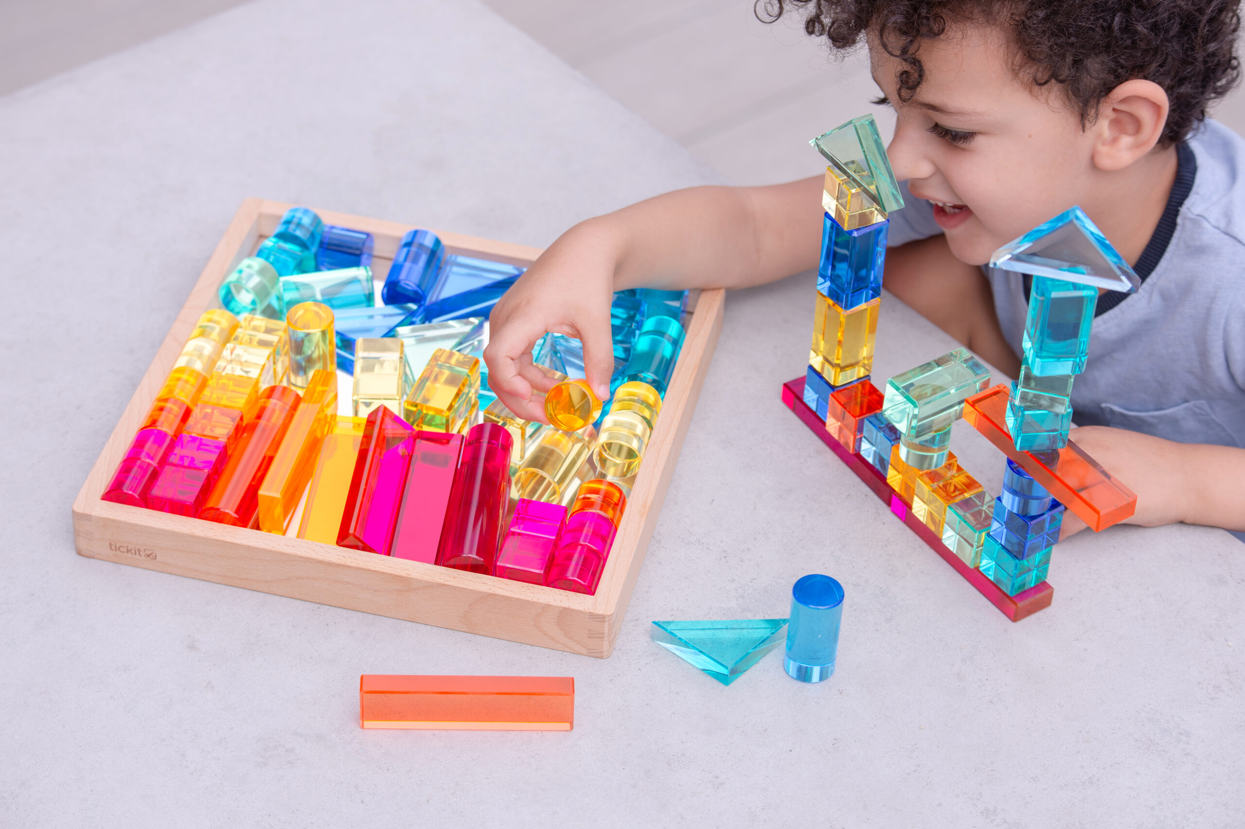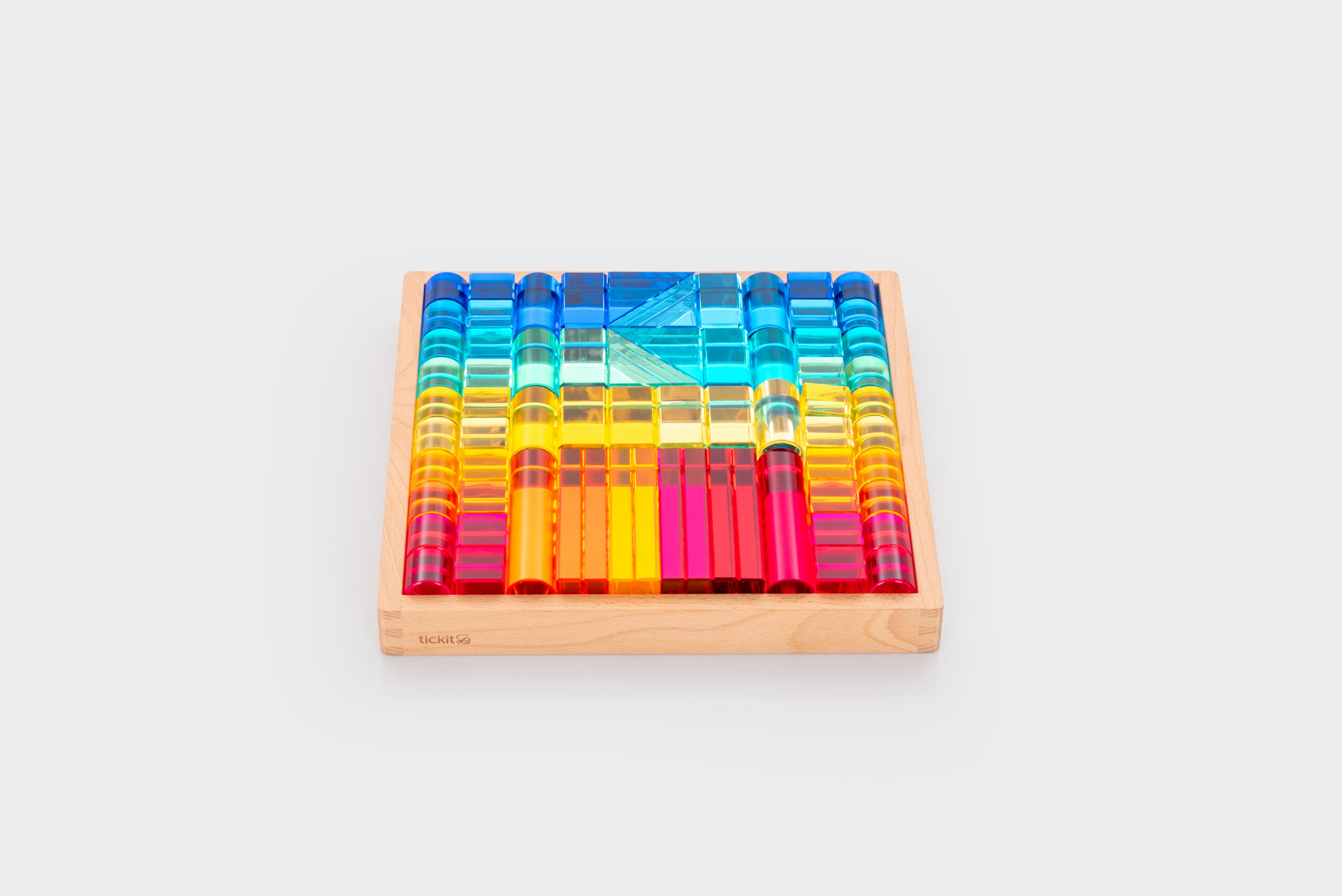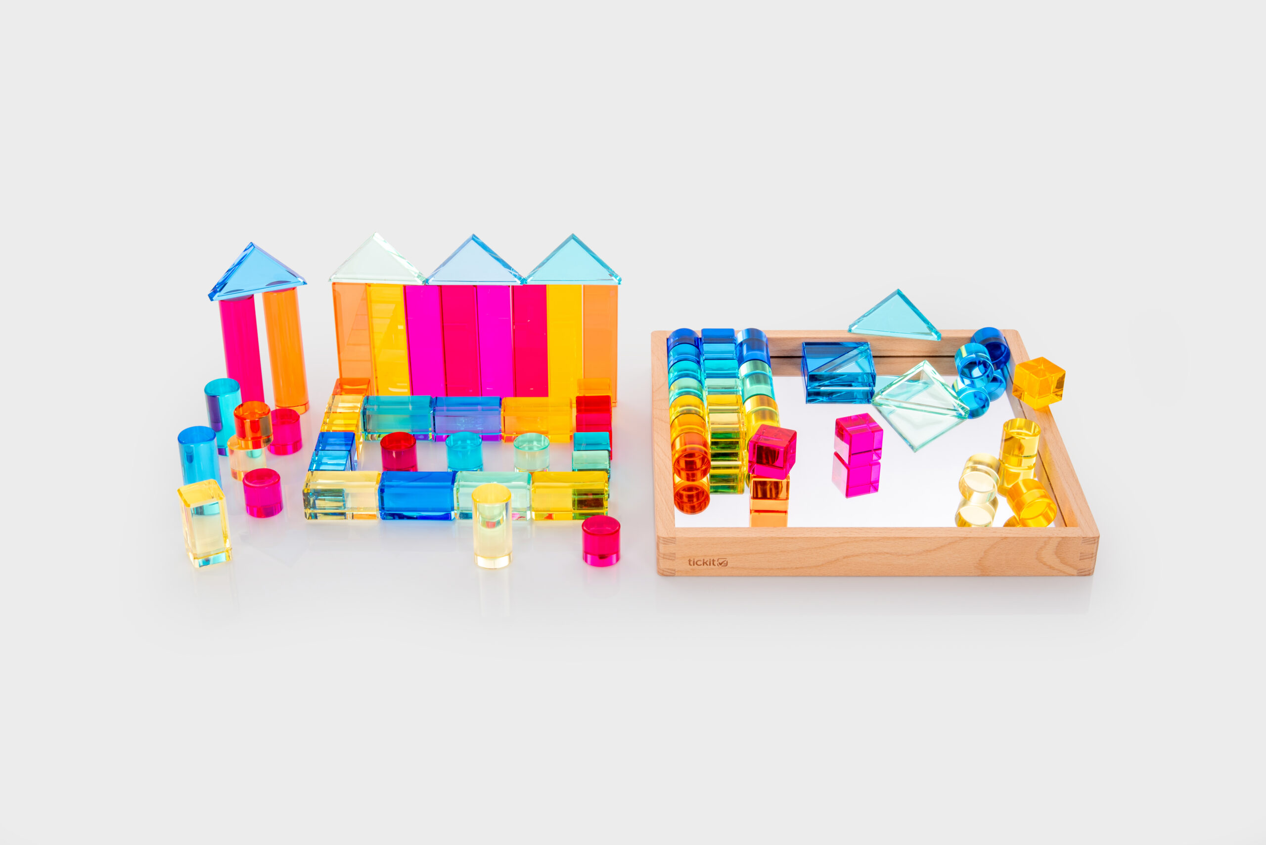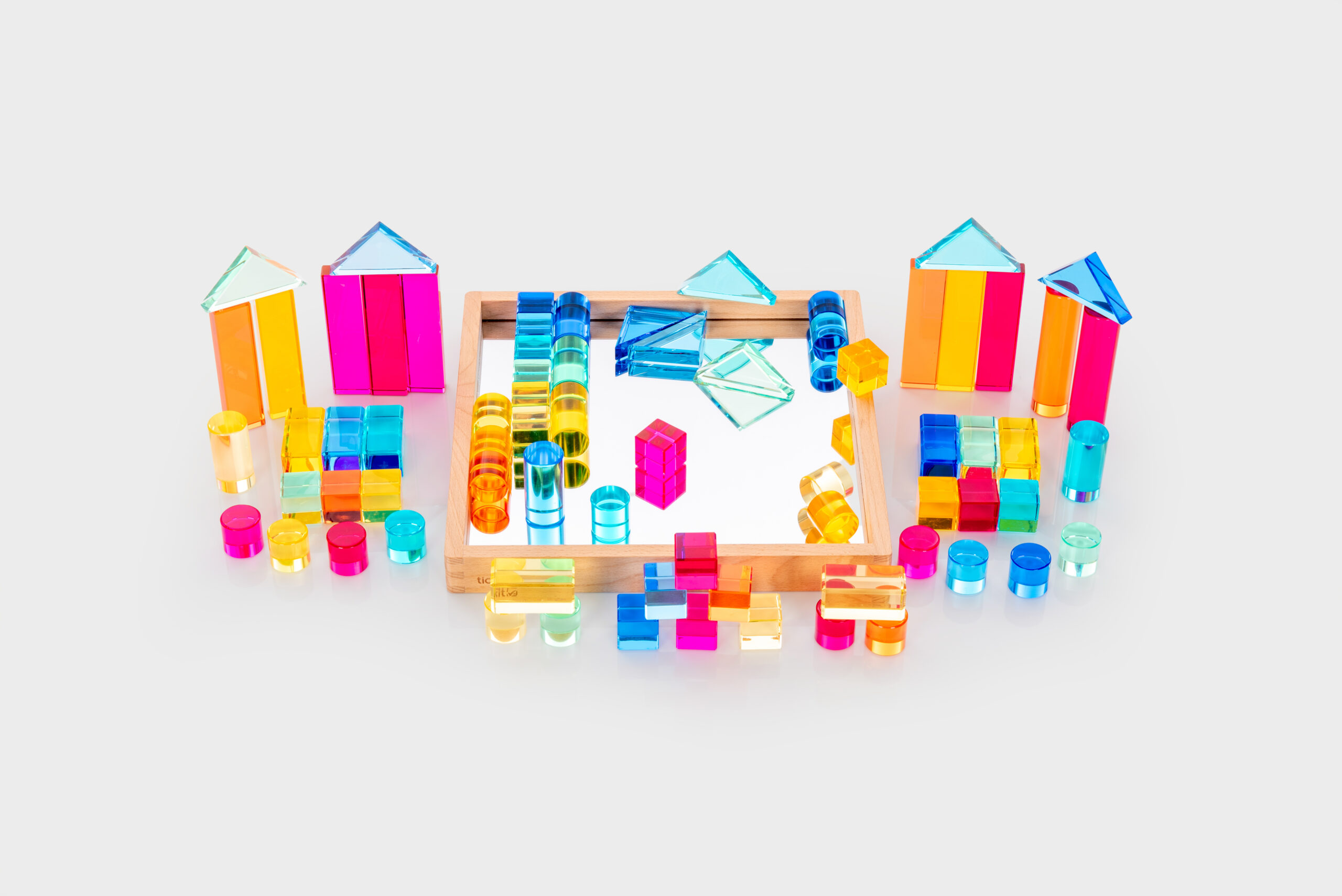 Tato velká stavebnice propojuje hladké průsvitné akrylové bloky v několika tvarech s jiskřivými křišťálově čirými „gem“ kostkami pro opravdu široké možnosti stavění. Děti mohou vytvářet jednoduché věže i složité architektonické konstrukce, zkoušet stabilitu, rovnováhu a různé způsoby skládání. Průsvitné materiály nádherně pracují se světlem a na zrcadlovém podnose vyniknou barvy i odlesky ještě výrazněji. Všechny dílky se pohodlně ukládají do kvalitního dřevěného podnosu z FSC certifikovaného bukového dřeva.