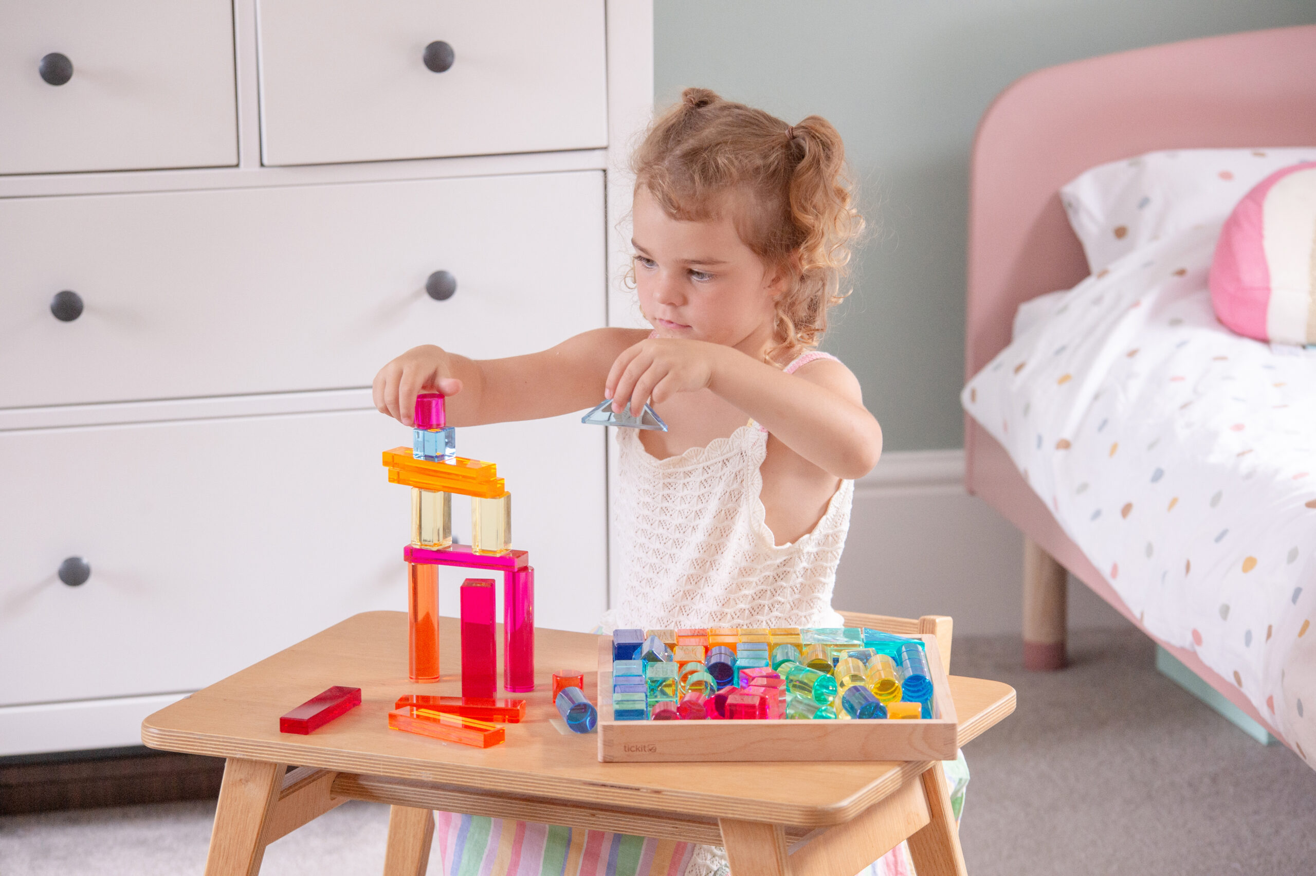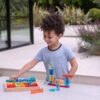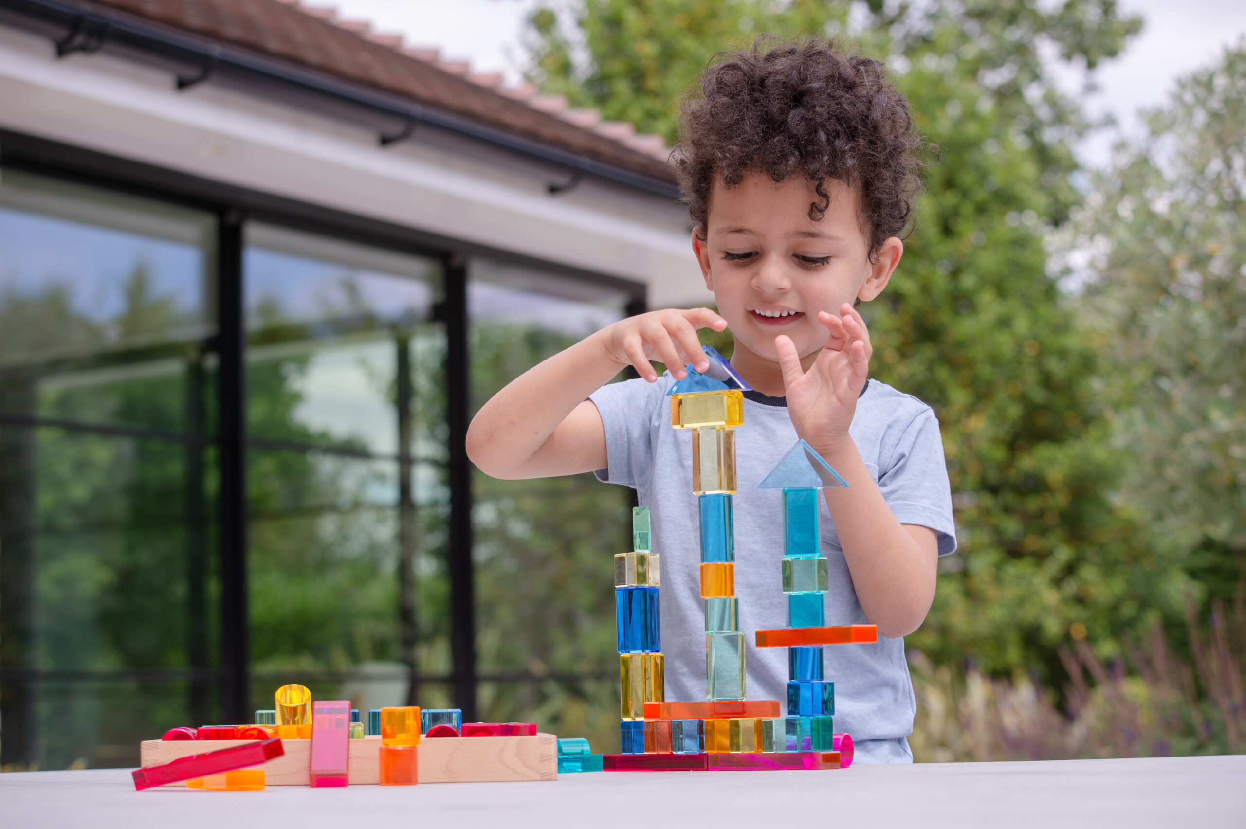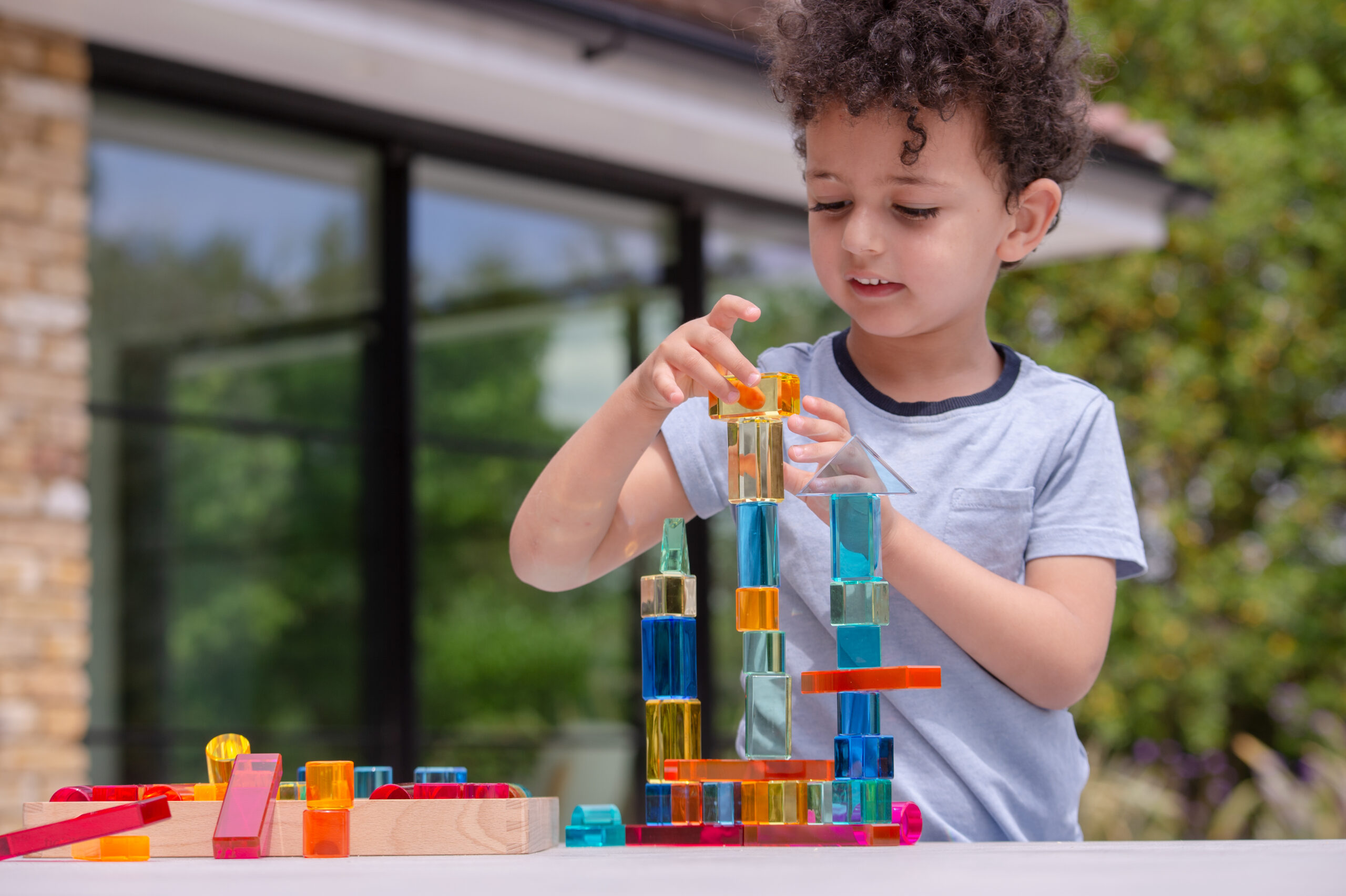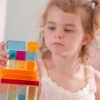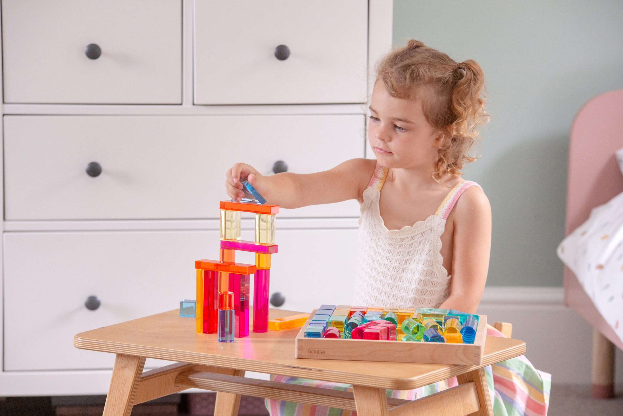 Tato velká stavebnice propojuje hladké průsvitné akrylové bloky v několika tvarech s jiskřivými křišťálově čirými „gem“ kostkami pro opravdu široké možnosti stavění. Děti mohou vytvářet jednoduché věže i složité architektonické konstrukce, zkoušet stabilitu, rovnováhu a různé způsoby skládání. Průsvitné materiály nádherně pracují se světlem a na zrcadlovém podnose vyniknou barvy i odlesky ještě výrazněji. Všechny dílky se pohodlně ukládají do kvalitního dřevěného podnosu z FSC certifikovaného bukového dřeva.