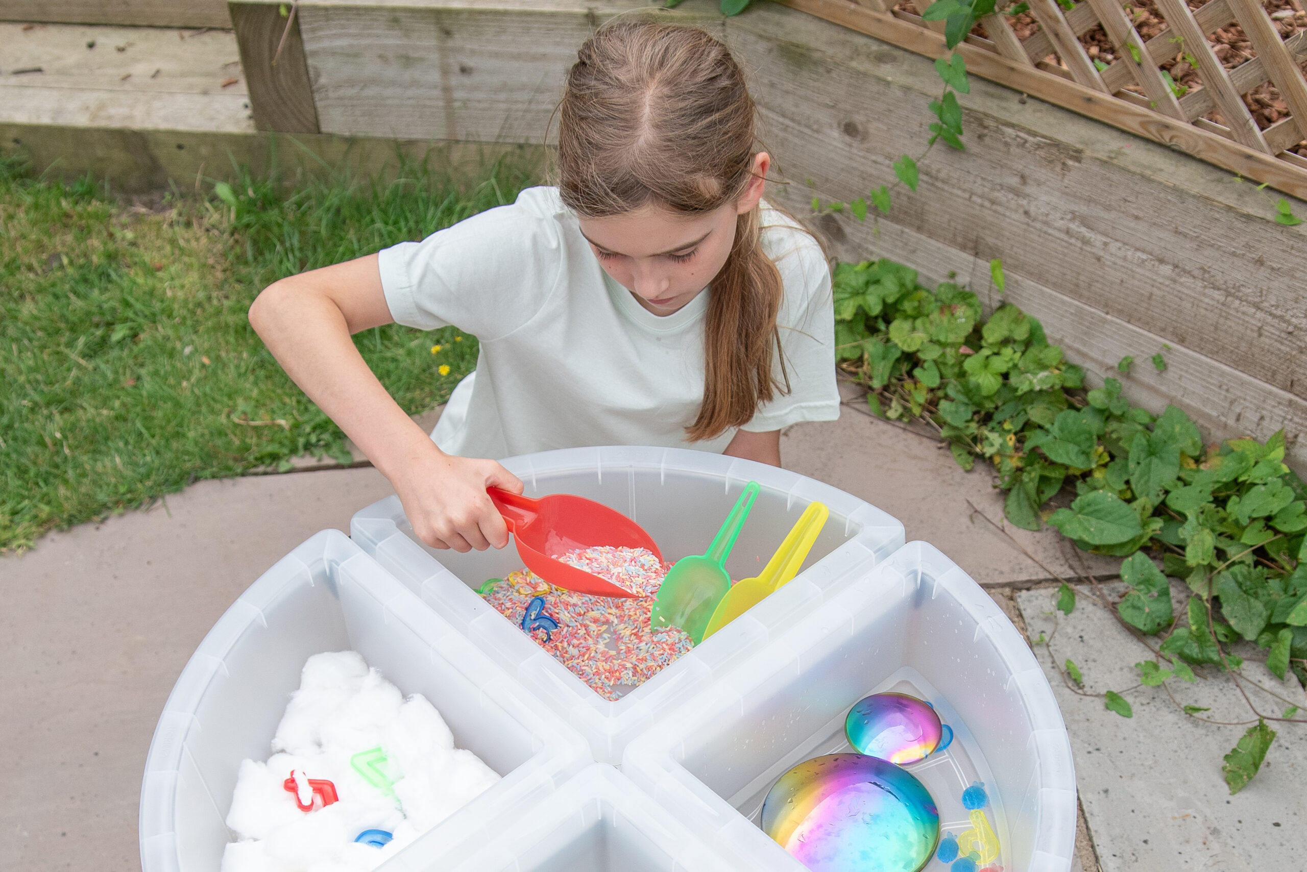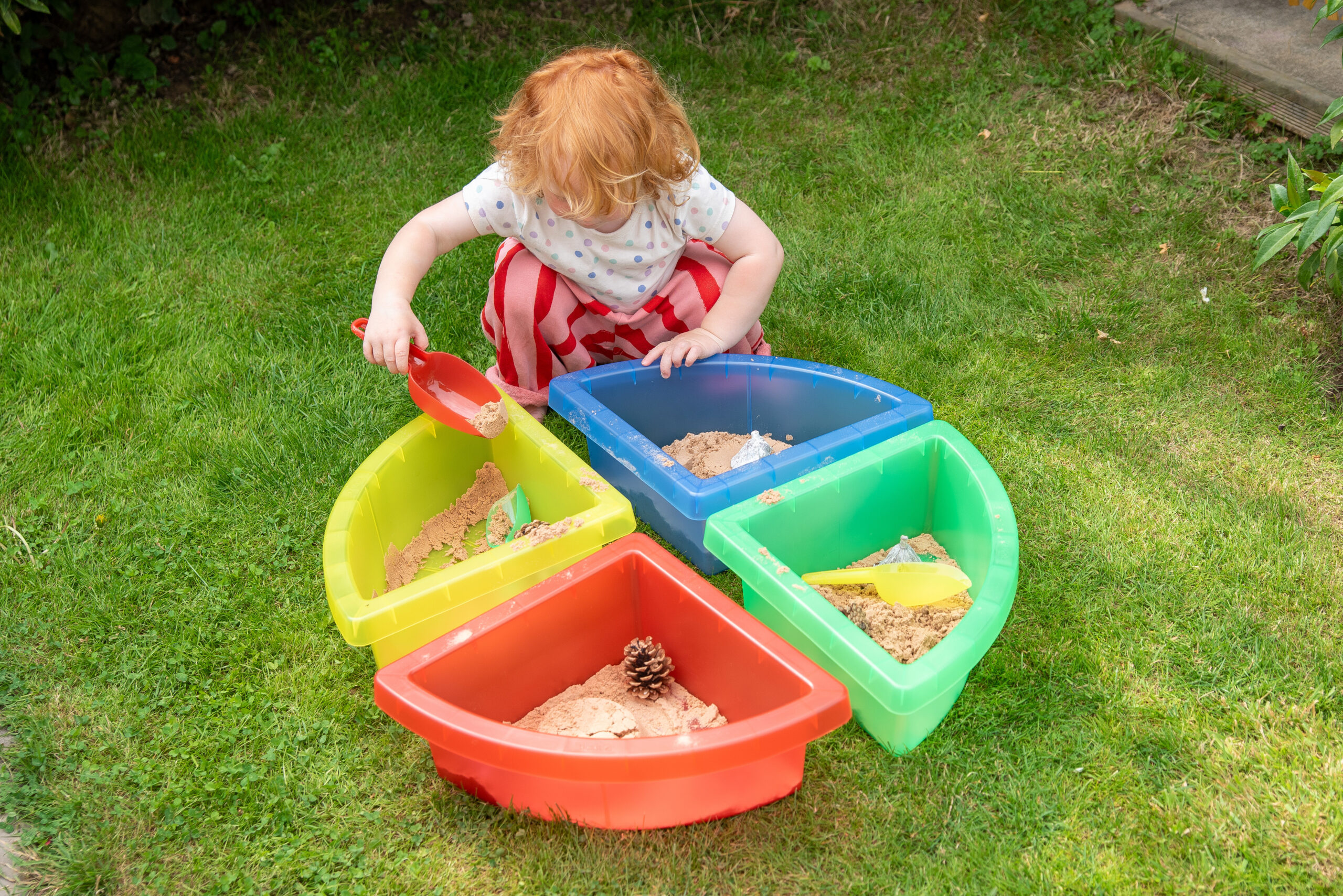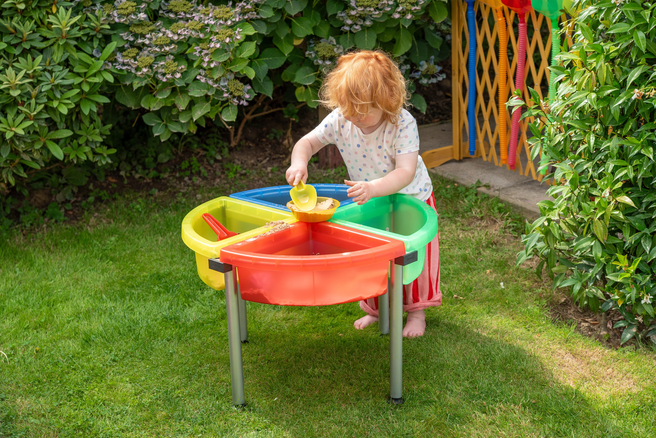- Vhodné pro hru s vodou, pískem i suchými materiály – doma i venku.