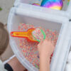 Každá naběračka má jasnou průsvitnou barvu, díky které děti vidí materiál skrz plast, což přidává vizuální stimulaci a rozšiřuje jejich smyslové vjemy během hry. Tyto lehké, ale odolné nástroje jsou ideální pro rozvoj koordinace ruka–oko, jemné motoriky a porozumění množství a objemu – ať už si děti hrají samostatně, nebo s kamarády u vodní tabule či pískoviště.