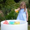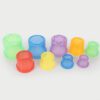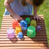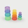 Translucent Colour Stacking Cups od TickiT jsou sada devíti barevných průhledných kelímků, které jsou ideální pro zkoumavé hry s pískem a vodou, rozpoznávání barev a učení se tvarům. Každý kelímek má na dně obrys určitého tvaru, který lze použít k vytváření otisků v mokrém písku, barvě nebo plastelíně. Kelímky mají také otvory pro počítání a umožňují průtok vody nebo jemného písku.