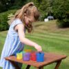Zábavné stohovatelné barevné kelímky, ideální pro použití při objevných hrách s pískem a vodou nebo pro určování barev a poznávání tvarů. Každý kelímek má na podstavci vyznačený jiný tvar, který lze použít pro tisk do vlhkého písku, barvy nebo modelíny. V každém kelímku jsou otvory pro počítání a pro prolití tekutého nebo jemného písku.