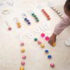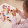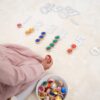 Svítivé akrylové „drahokamy“ v elegantních obroučkách z FSC® bukového dřeva přinášejí dětem fascinující kombinaci jasu a přírody. Každý korálek je oboustranně fazetovaný, což zajišťuje maximální odraz světla a záblesky, které děti uchvátí. Díky otvoru uprostřed lze korálky navlékat na tři šňůrky (součást balení), aby vznikly barevné sekvence a vzory – ideální pro rozvoj jemné motoriky, koordinace oko–ruka, třídění a počítání. Sada podporuje také tvorbu popisných příběhů a rozvoj řečových dovedností.