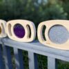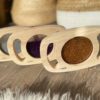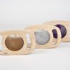 Sada 3 rámů z masivního kaučukového dřeva s rukojeťmi pro snadné uchopení, které obklopují panel s třpytivými třpytkami, jeden v každé barvě – fialová, stříbrná a zlatá. Panely lze točit a otáčet, aby se třpytivá kapalina pohybovala a proudila fascinujícím způsobem.