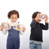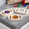 Easy Hold Glitter Panel Set od TickiT je sada tří pevných rámů z kaučukového dřeva s ergonomickými úchyty, které obsahují třpytivé panely ve třech barvách: fialové, stříbrné a zlaté. Otáčením a nakláněním panelů se třpytky uvnitř pohybují a vytvářejí fascinující vizuální efekty, což podporuje smyslové vnímání a rozvoj slovní zásoby u dětí.