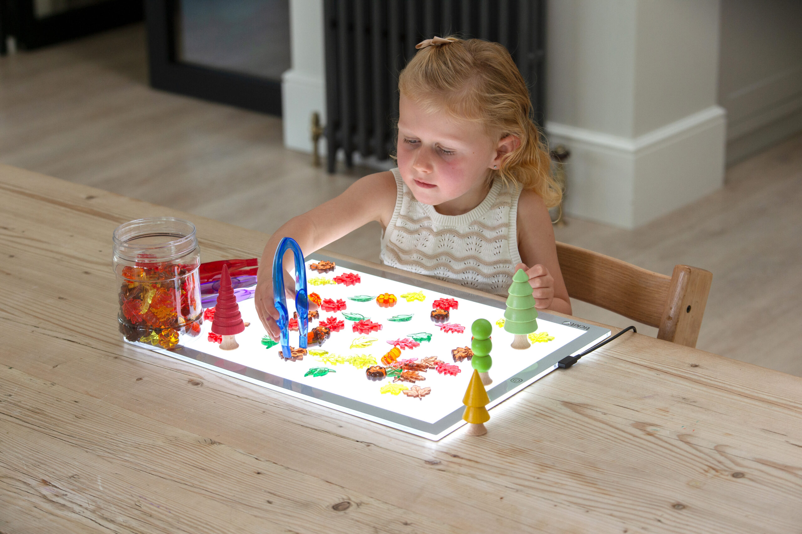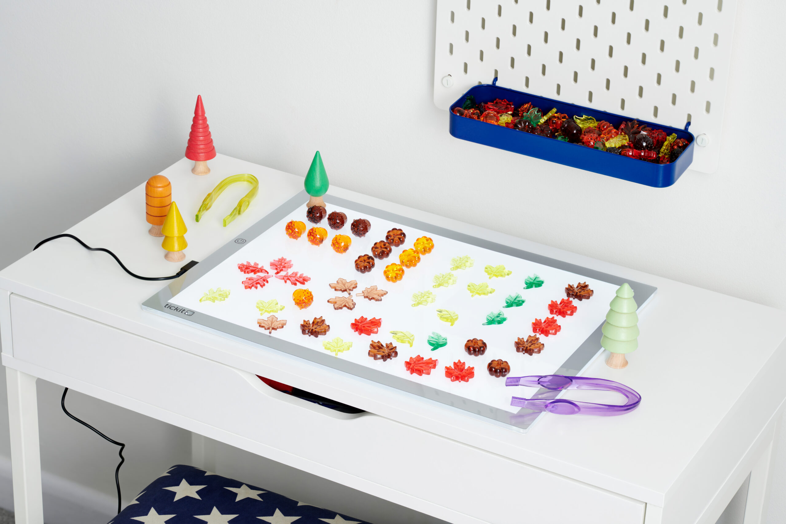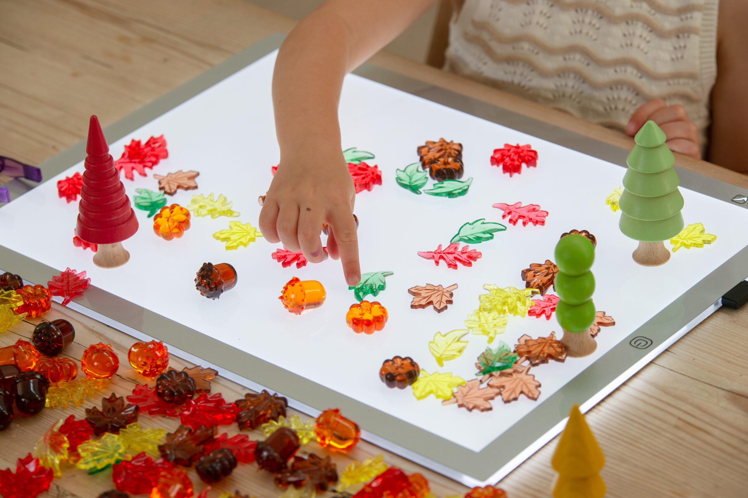 Průsvitné, jasné barvy (červená, oranžová, žlutá, zelená a hnědá) se nádherně rozsvítí na světelném panelu, což zvyšuje vizuální atraktivitu a dělá učení ještě zábavnějším. Každý tvar je detailně propracovaný — od žaludů přes dýni až po různé typy listů — a vybízí děti k prozkoumávání dotykem i pohledem.