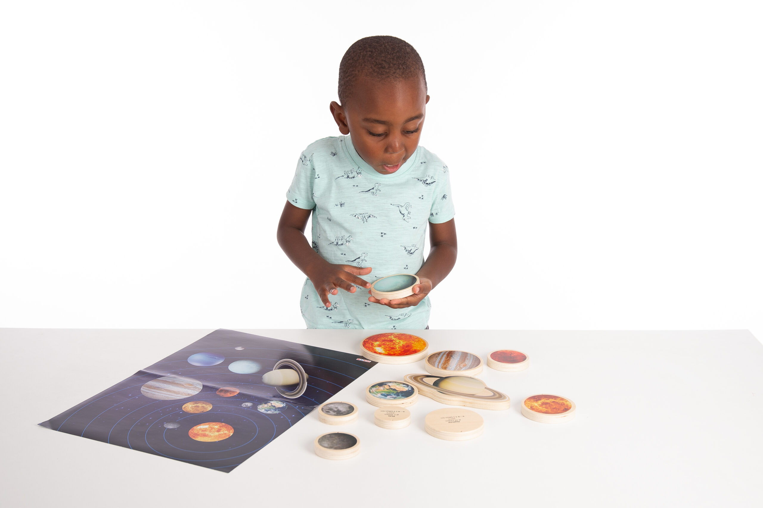 Hladké, zaoblené dřevěné kotouče z překližky jsou ideální pro malé ruce — snadno se drží, otáčí a prohlíží. Skvělá sada pro děti, které se chtějí dozvědět více o hvězdách, planetách a Sluneční soustavě. Podporuje popisné vyjadřování, představivost, jemnou motoriku a pomáhá vytvářet hlubší porozumění světu i vesmíru.