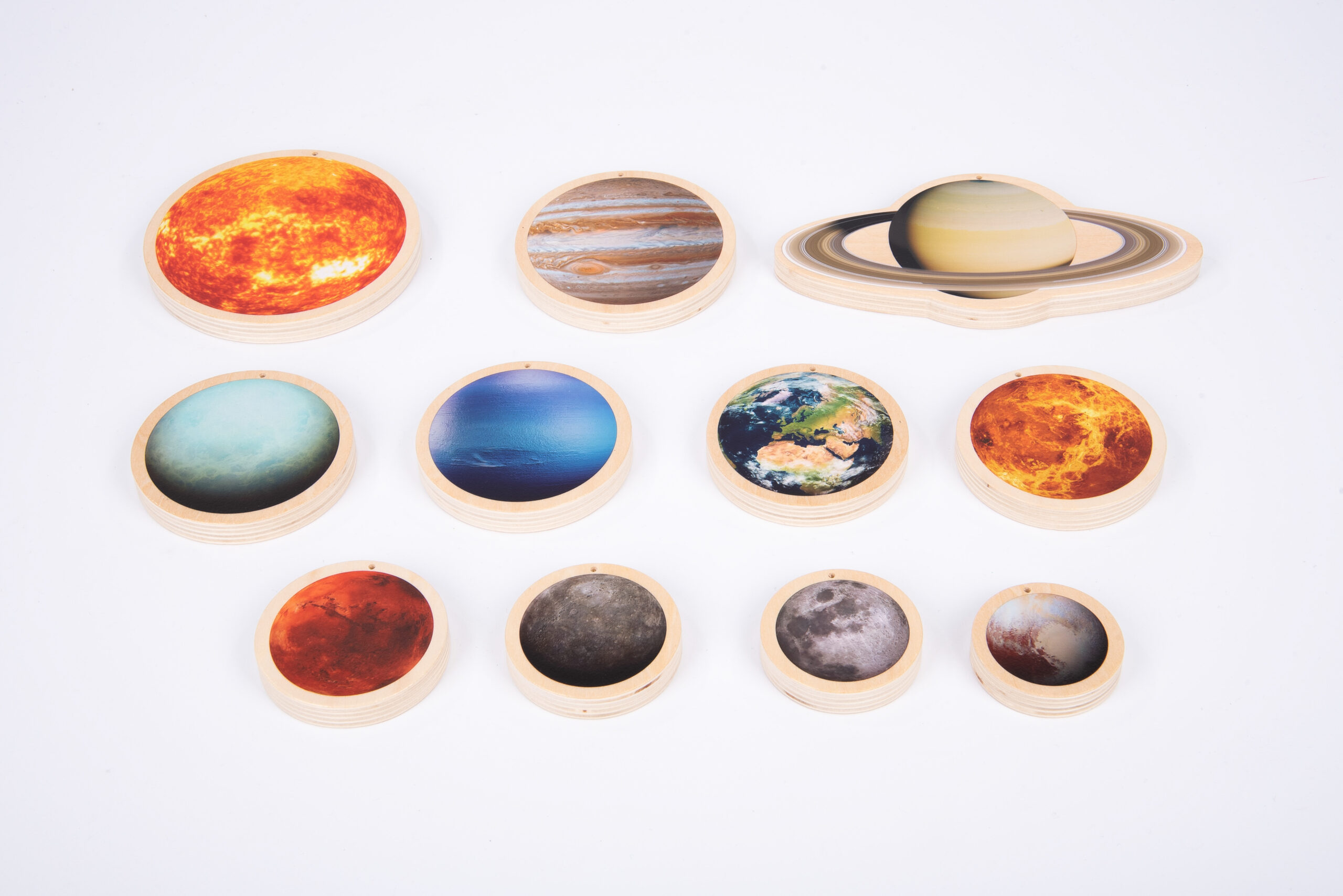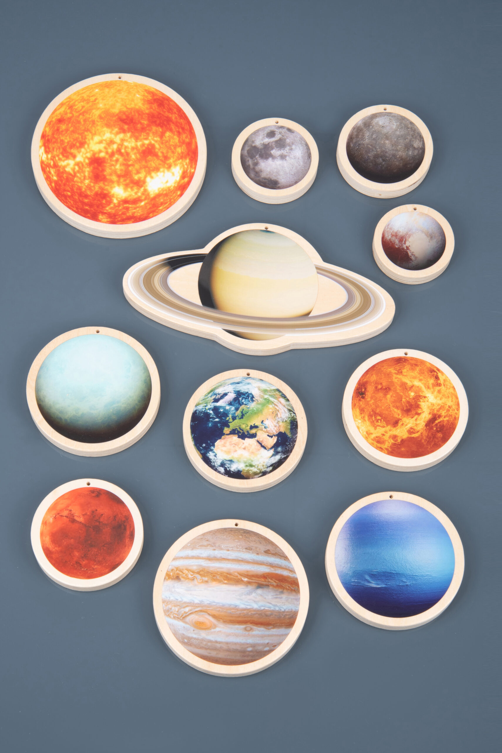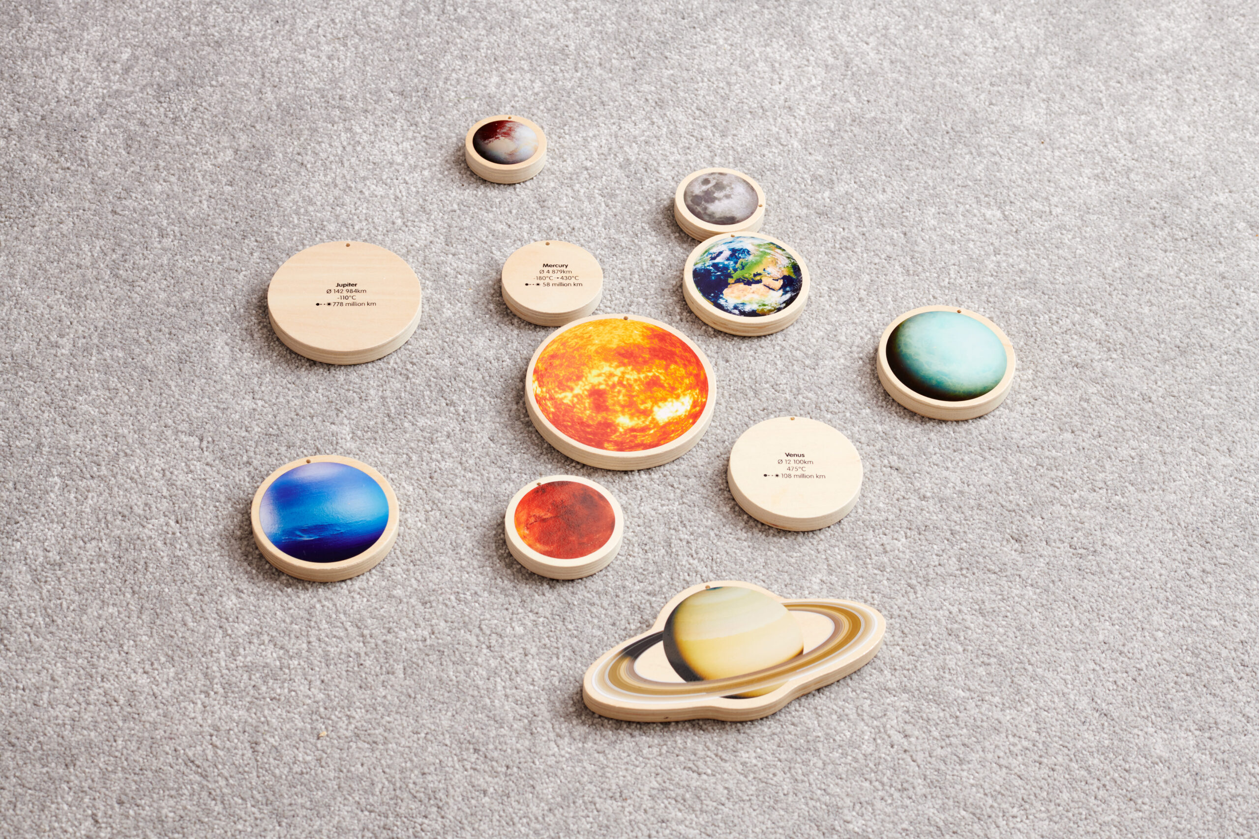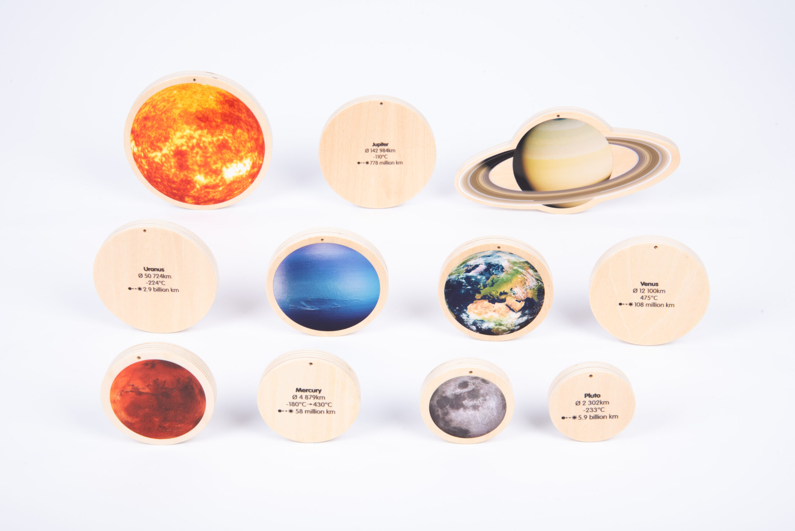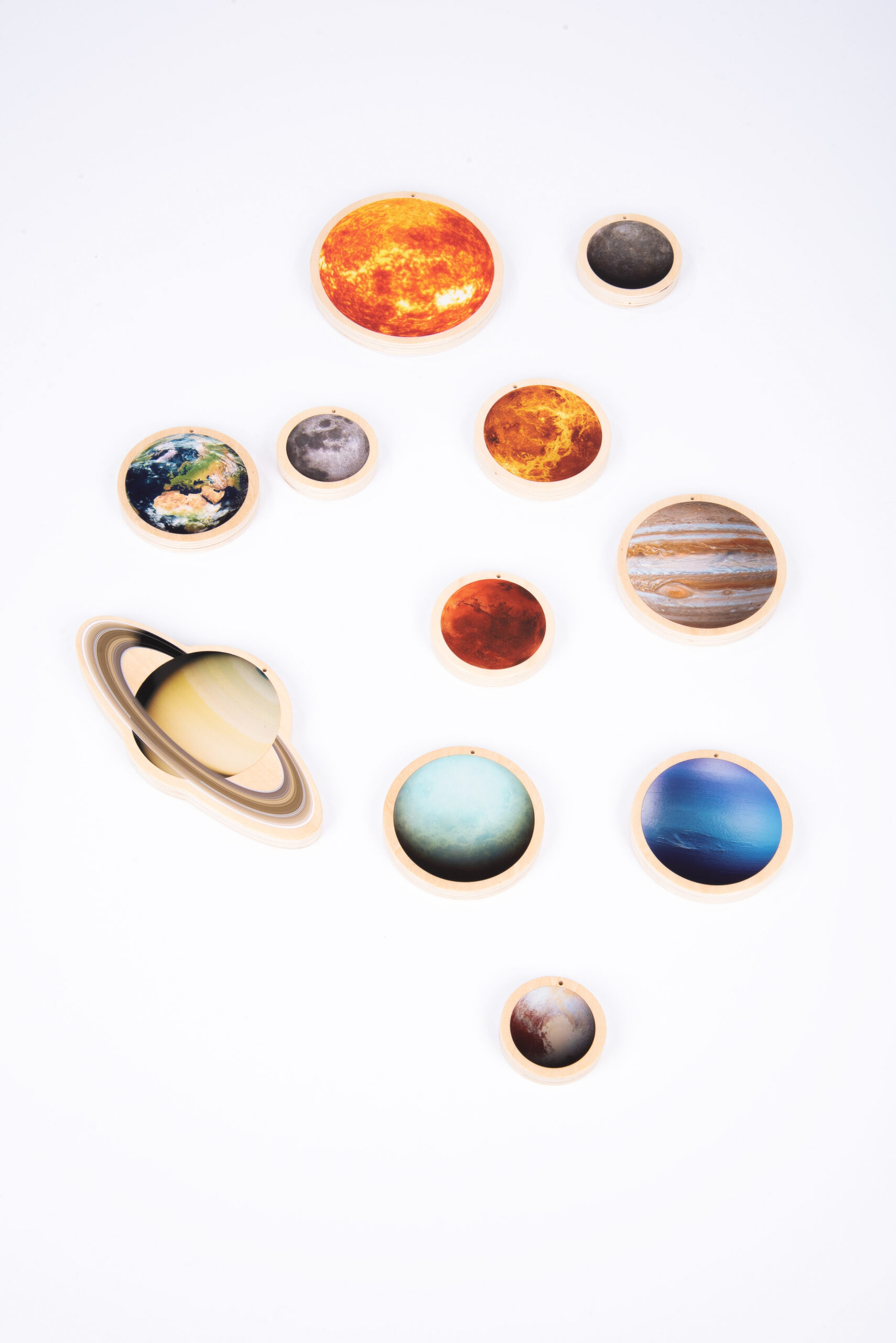 Objevte vesmír s touto nádhernou sadou dřevěných disků, které znázorňují Slunce, planety, náš měsíc i Pluto. Každý disk je potištěný realistickou ilustrací na jedné straně a technickými údaji na straně druhé — krásná kombinace vizuální zábavy a vzdělání. Díky otvoru pro zavěšení a dostatečné tloušťce lze disky použít také jako mobil, případně vystavit na rovné ploše. Hračka posiluje dětskou představivost, jemnou motoriku a pomáhá rozšiřovat znalosti o vesmíru. Vyrobeno tak, aby bylo příjemné na dotek a snadno ovladatelné i pro malé děti. Vhodné pro děti od 12 měsíců jako poutavá pomůcka pro hru i vzdělávání.
