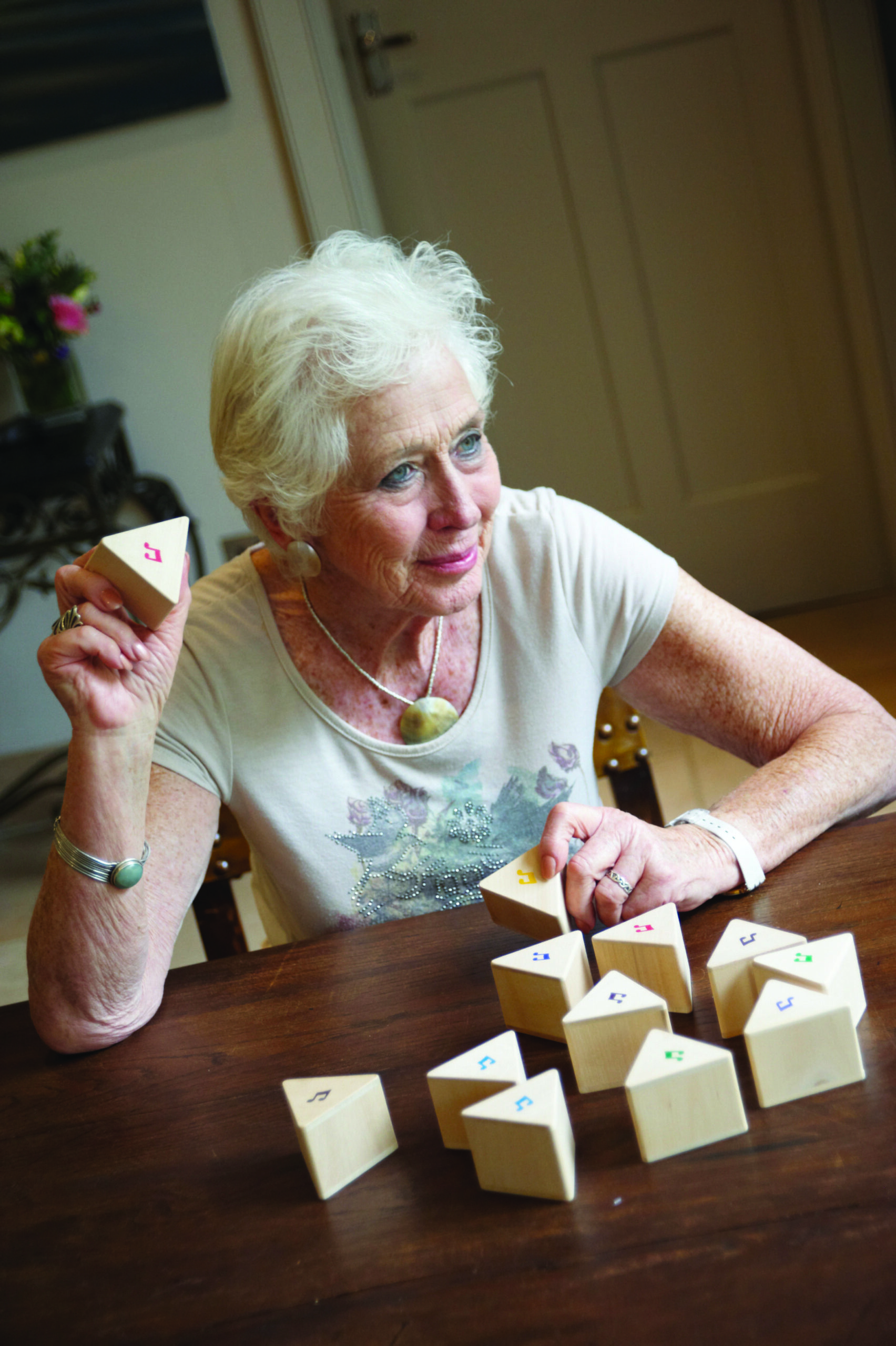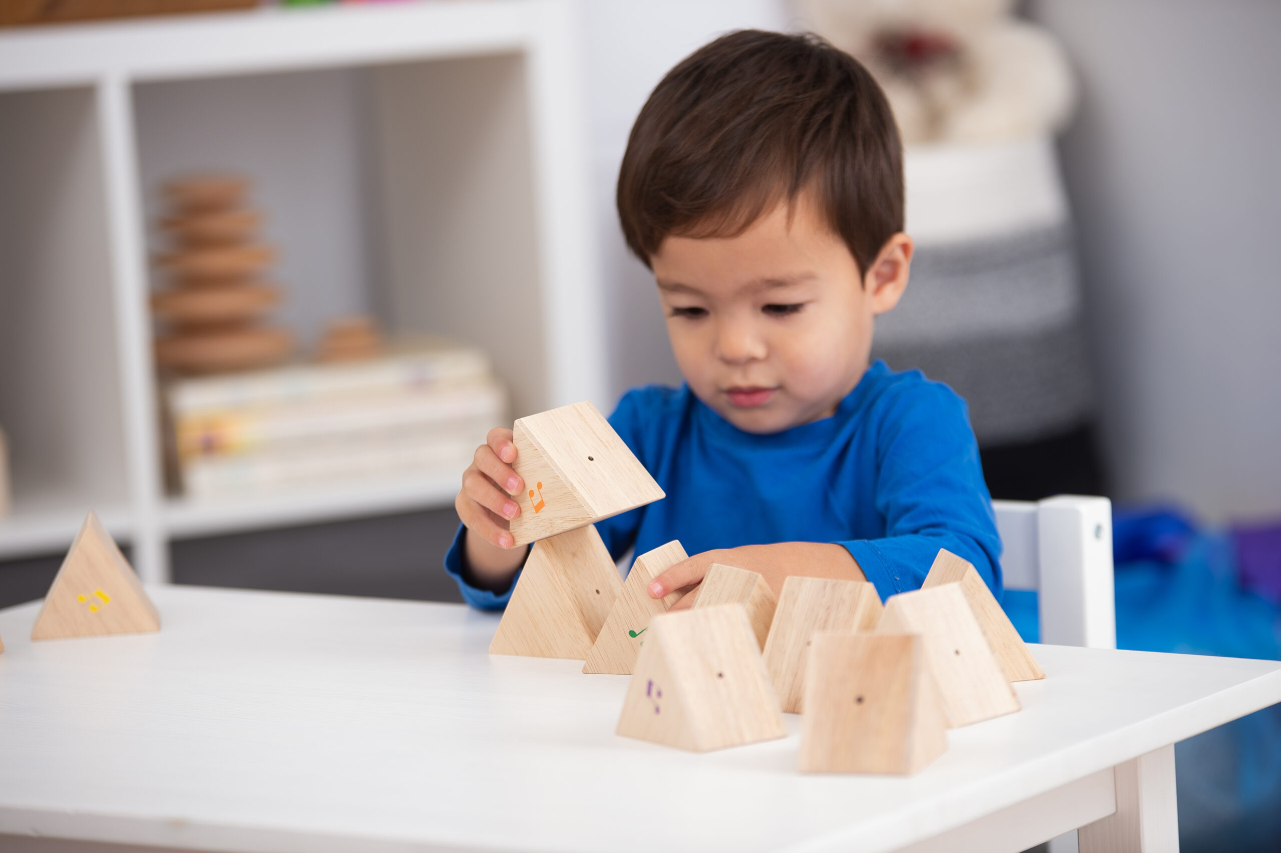 Sada dřevěných zvukových hranolů od tickit® obsahuje šest párů krásných trojúhelníkových hranolů z tvrdého dřeva. Každý hranol má barevný hudební notový motiv pouze na jednom konci, takže je lze obracet a objevovat, které kusy vydávají stejný zvuk a které ne. Skvělá hra s dítětem, která podporuje objevování zvuku a rozvoj řečových schopností.