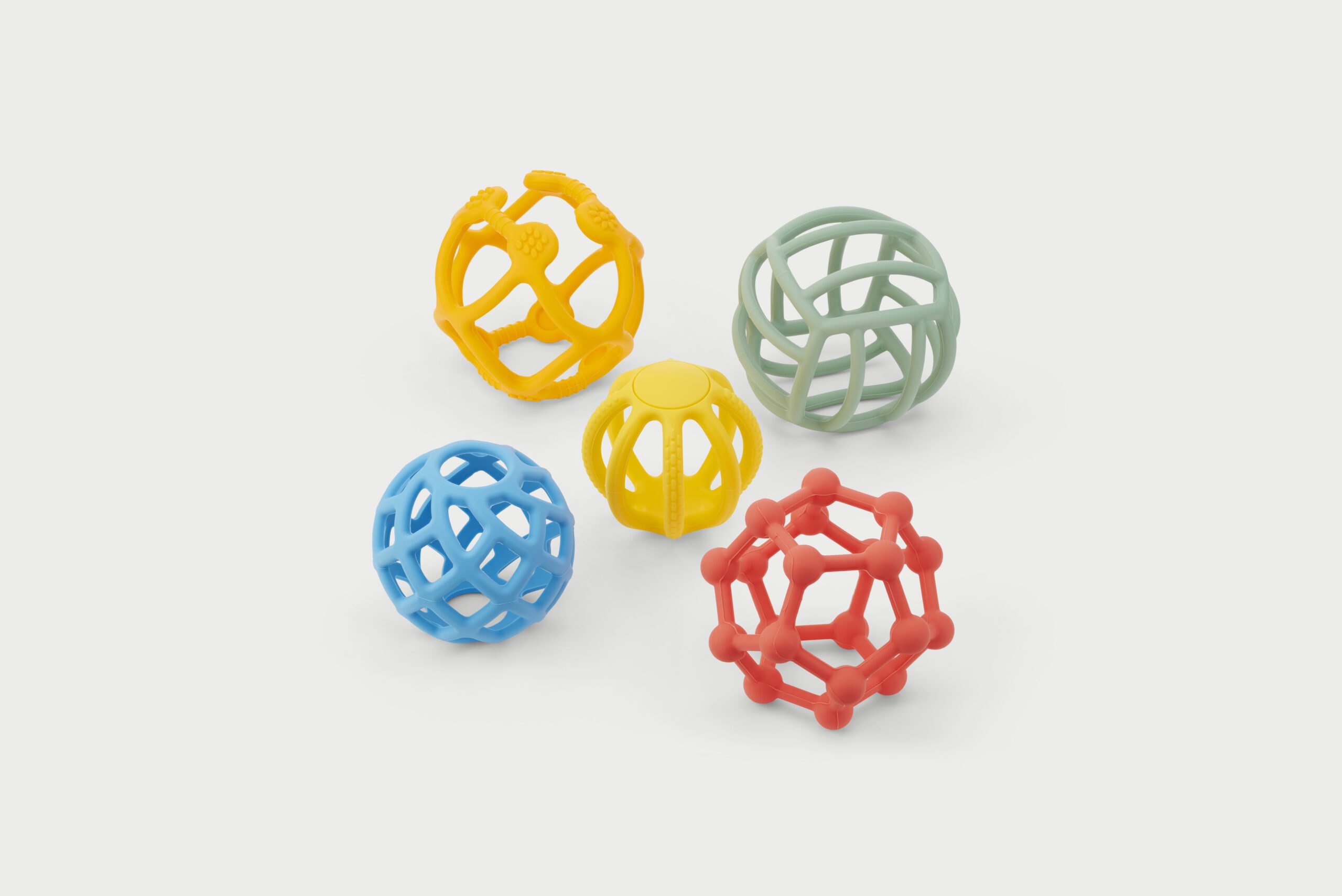 SiliSoft® Flexi Balls (Rainbow) představují sadu pěti pružných silikonových koulí ve tvaru sítě (cage‑balls), navržených speciálně pro smyslovou hru a kreativní objevování. Každá koule má jiný průměr (cca 70–100 mm) a perforovaný povrch s odlišným tvarem otvorů, což umožňuje rozmanité způsoby hry. Hodí se k otáčení, mačkání, válení v písku nebo namazání barvou pro razítkování textur na papír.