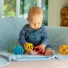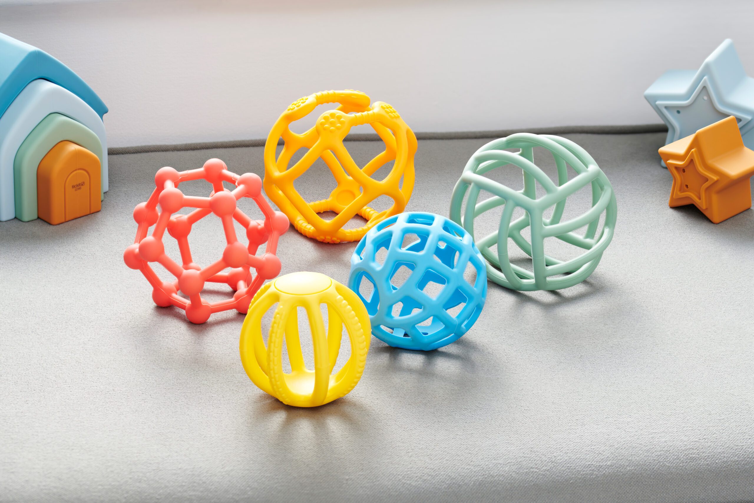 Měkký, potravinářský silikon podporuje hmatové vjemy a zároveň je hygienický a snadno omyvatelný – vhodný i do myčky. Malé reflexní nebo drobné silikonové sensory prvky lze vložit dovnitř pro zvýšení pohybu a zábavy.