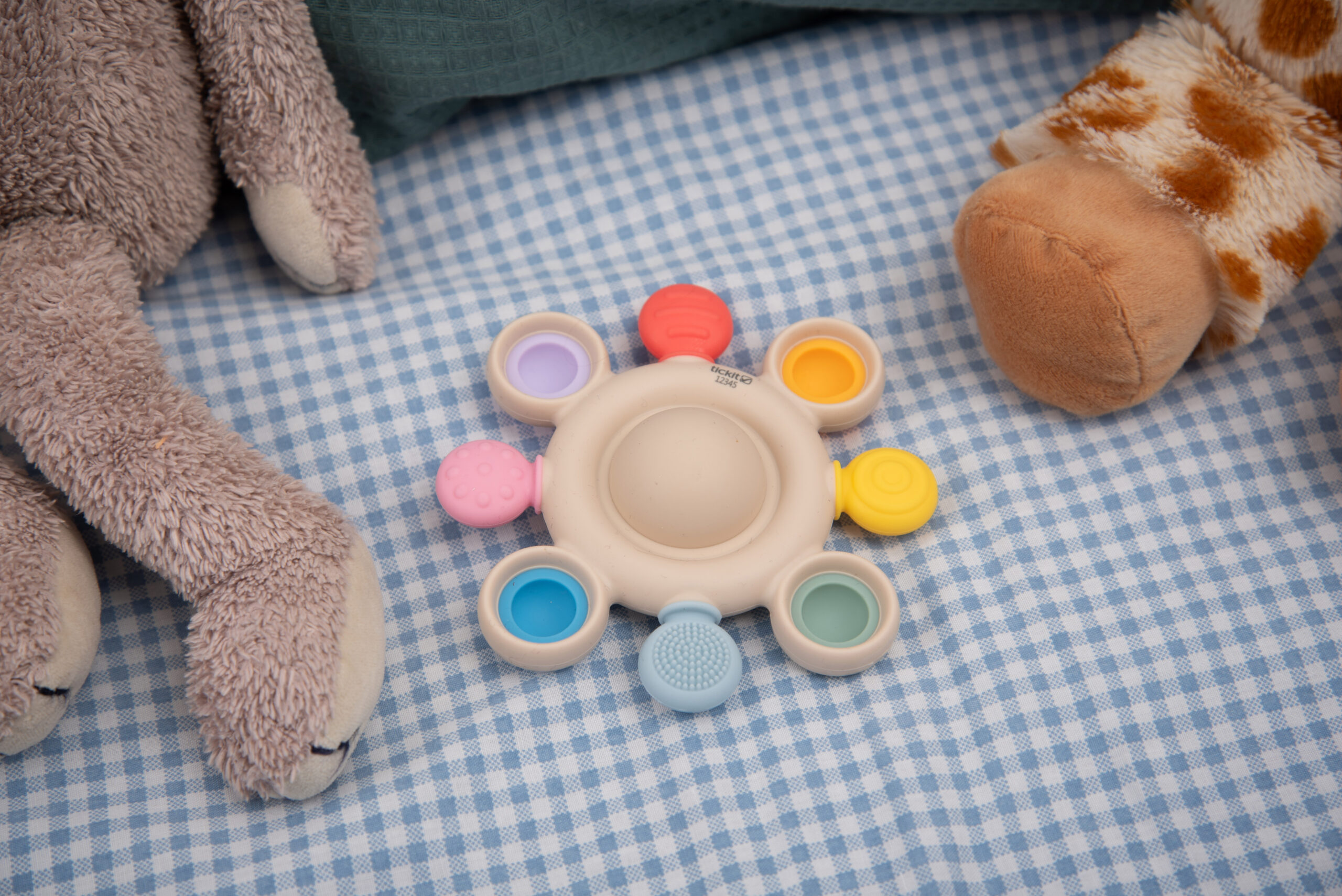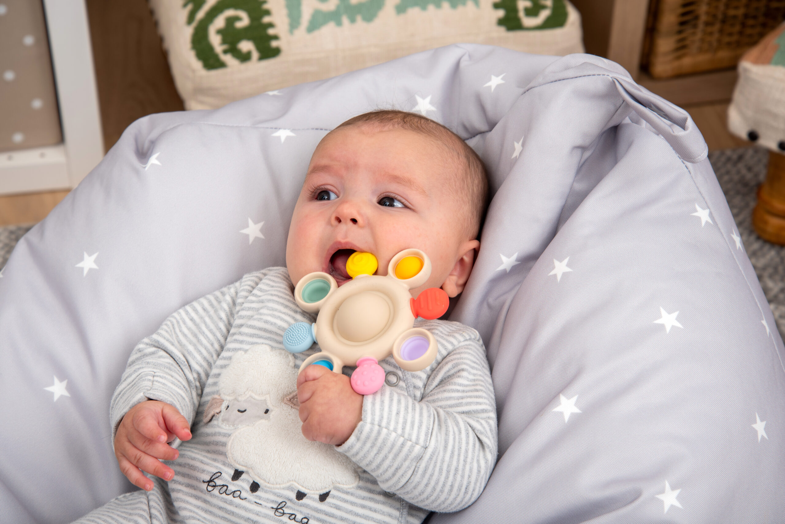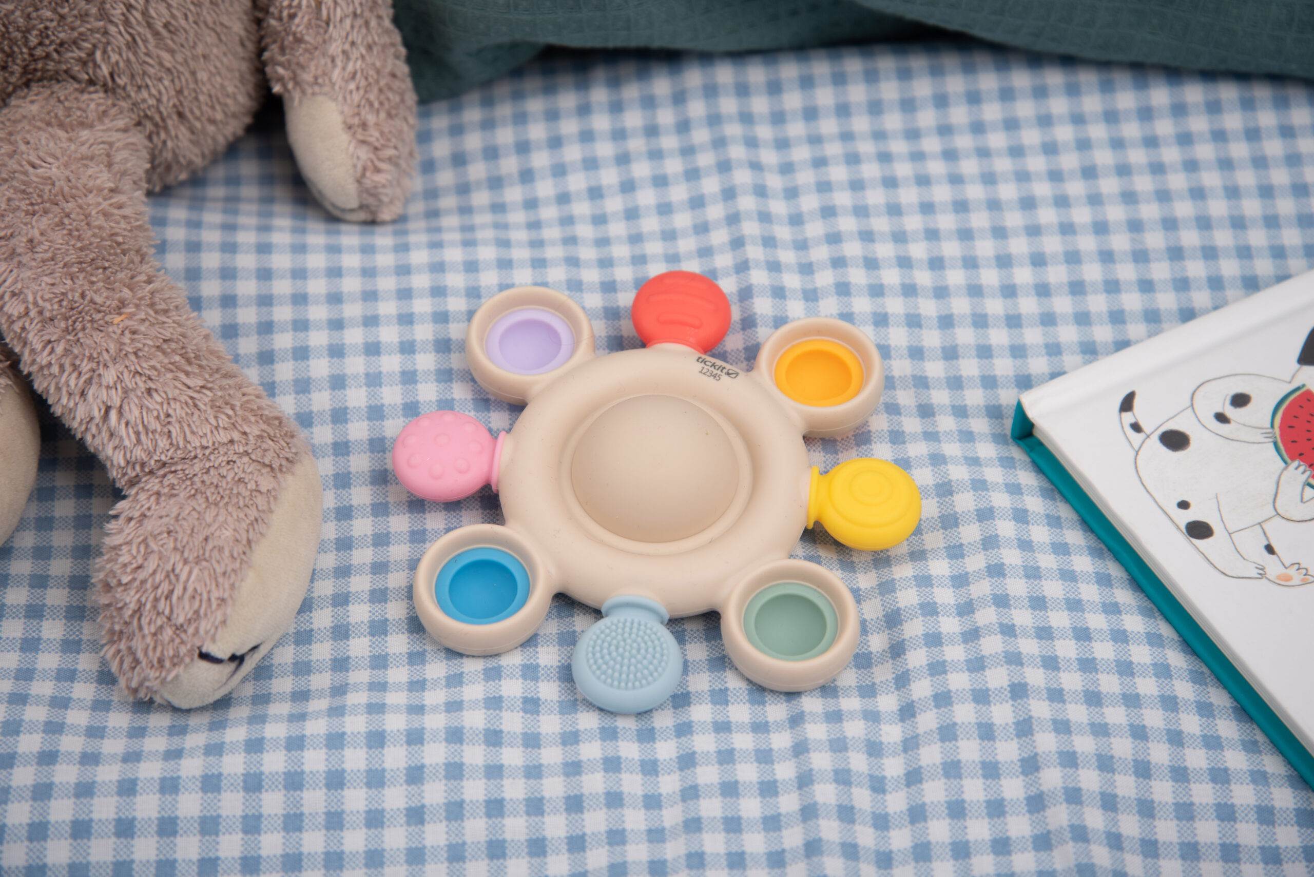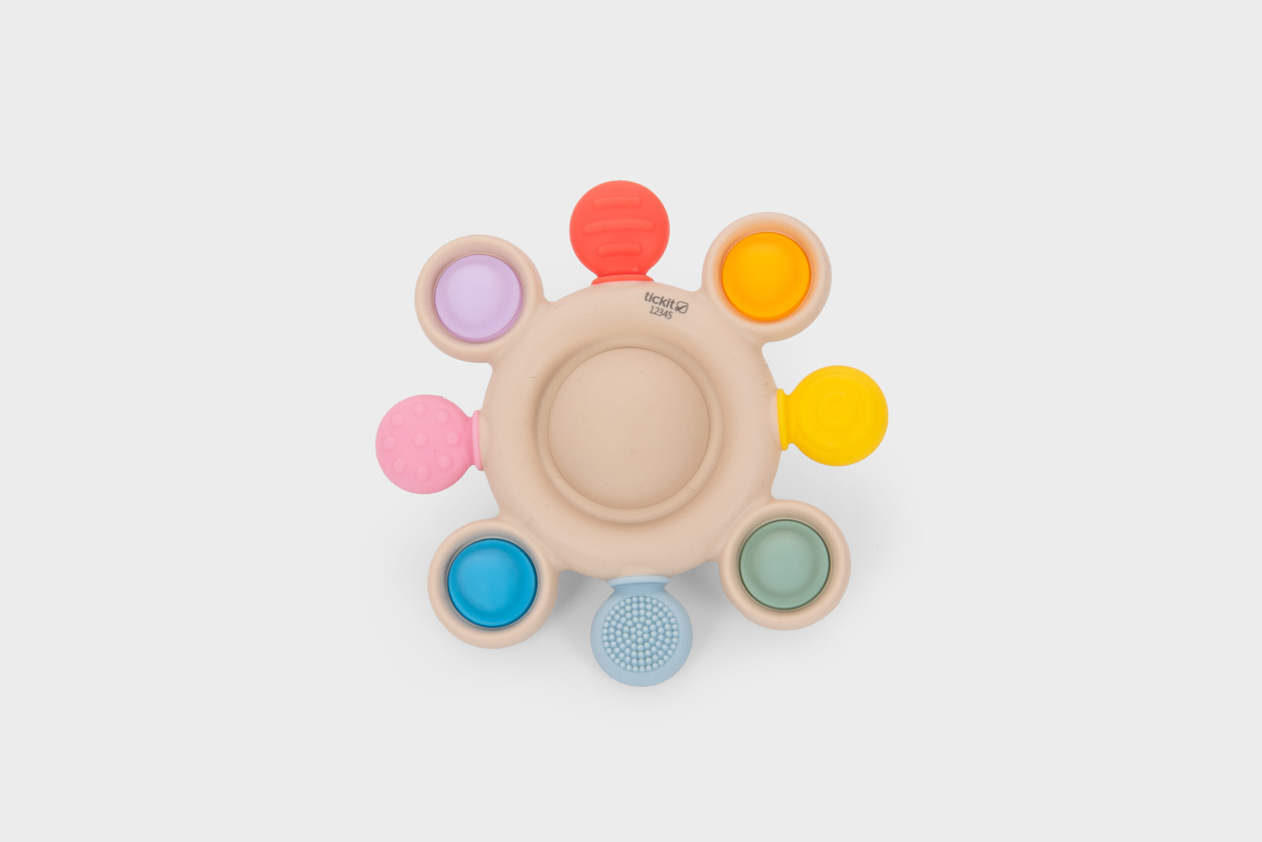 Barevná pop tlačítka poskytují příjemný klikavý efekt při mačkání a podporují objevování příčiny a následku a rozvoj jemné motoriky. Okolo nich jsou různé texturované kousací prvky, které nabízejí úlevu od bolesti dásní a stimulují hmatové vnímání. V centru hračky se nachází jemné chrastítko, které při otřesu upoutá pozornost dítěte a přináší zvukový stimul pro rozvoj sluchu.