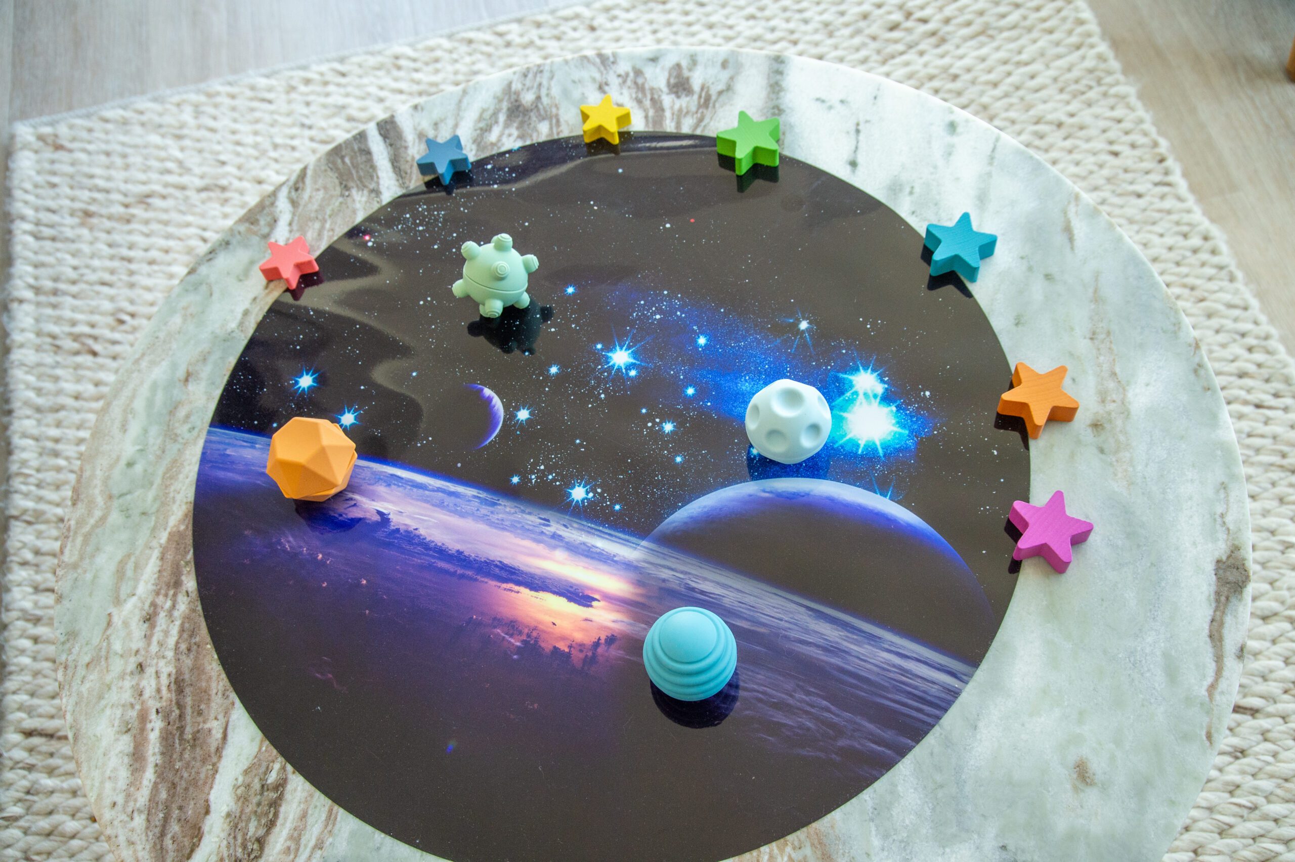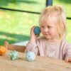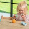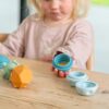 - Rozvíjení smyslového vnímání: hmatové povrchy + zvukový šejkr v jedné hračce