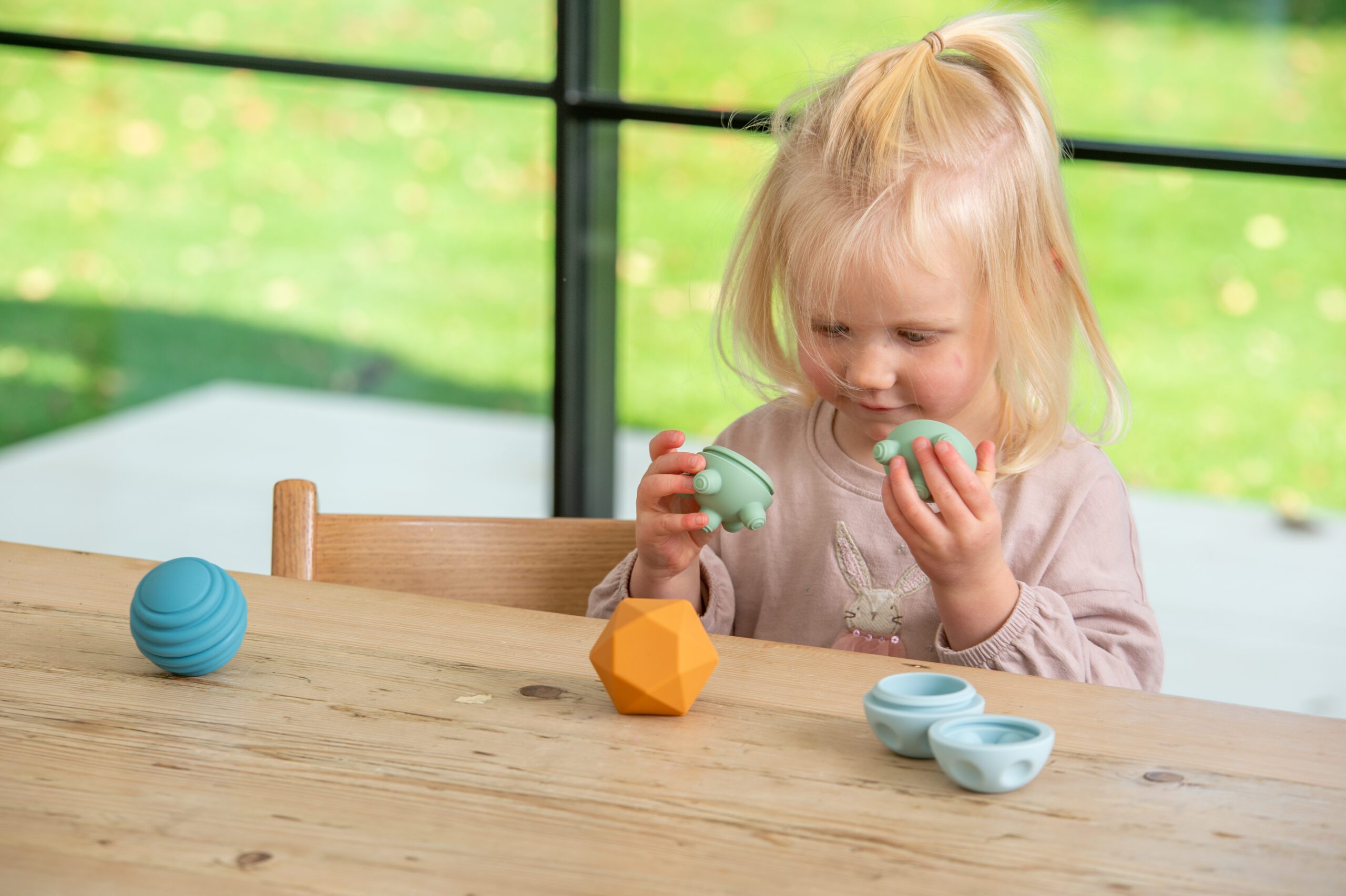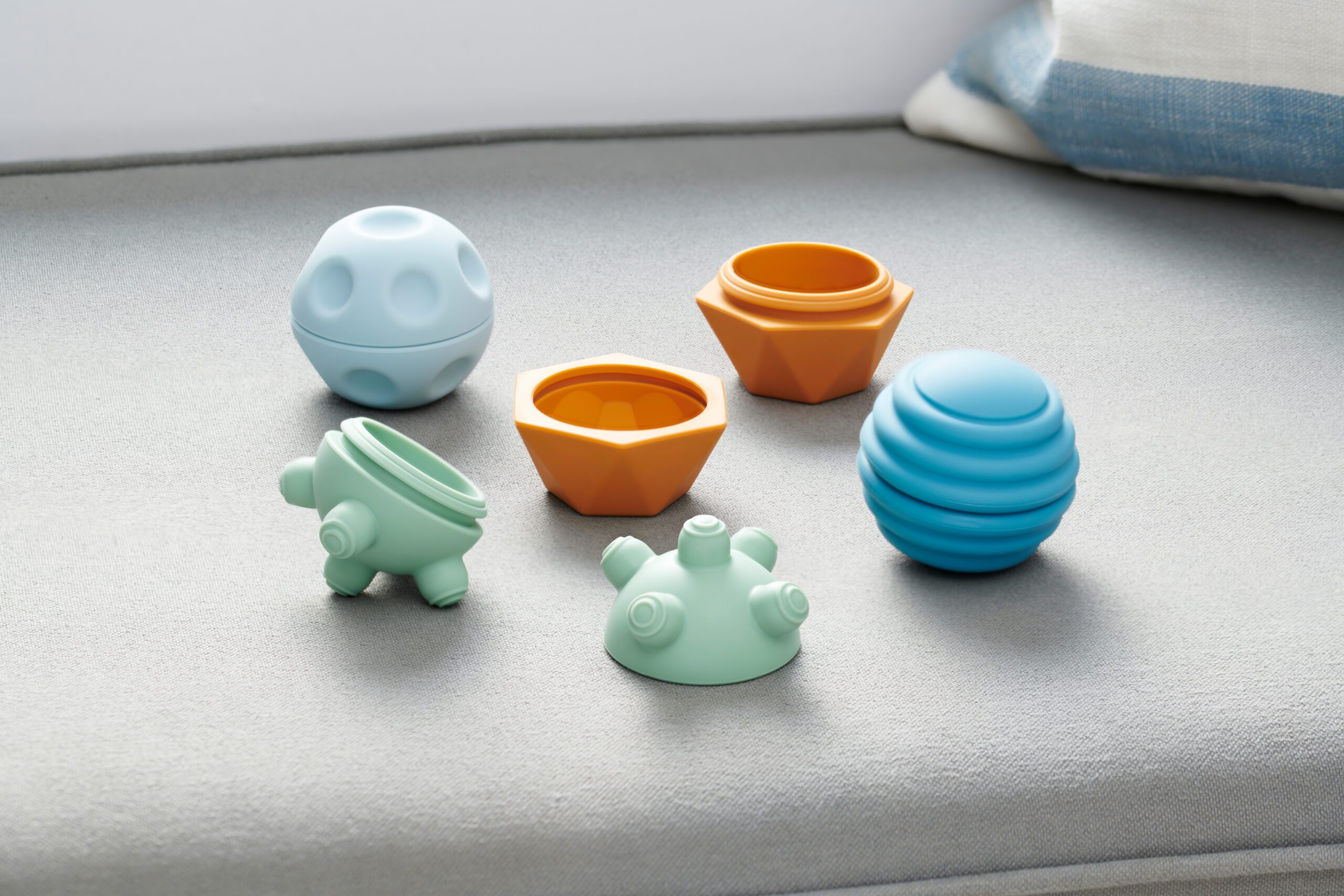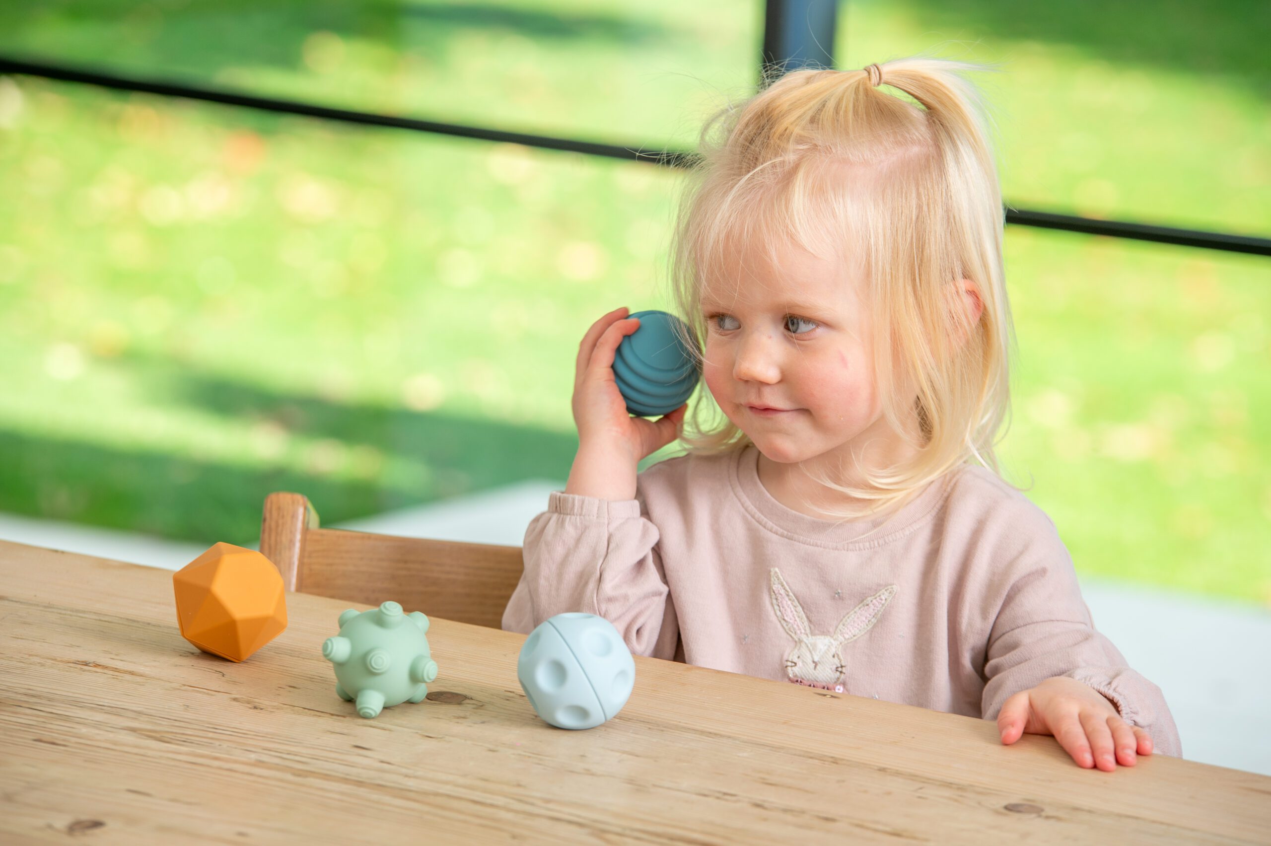 SiliSoft® Sensory Twist Balls (Neutral) je sada čtyř měkkých silikonových koulí s různou texturou — každý má vroubkovaný, bodlinkový nebo drážkovaný povrch, který zve k hmatovému objevování. Každá koule má unikátní mechanismus „twist‑to‑open“ — po zatočení se otevře a odhalí dutý vnitřek, kam lze vložit sušené luštěniny nebo korálky, a vytvořit tak vlastní šejkr. Tato kombinace povrchové stimulace a zvukového elementu podporuje smyslové vnímání, sluch i hmat a poskytuje prostor pro rytmické experimentování . Vyrobena z bezpečného potravinářského silikonu, je měkká, flexibilní a hygienická — snadno se čistí a vhodná i do myčky