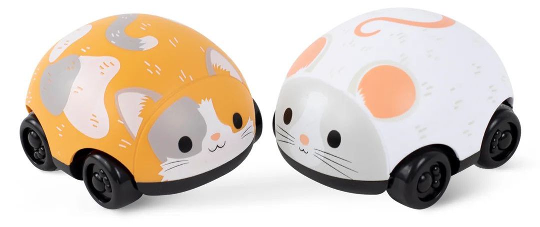 Roztomilá dvojice kočky a myši přináší dětem jednoduchou, ale neodolatelně zábavnou hru. Stačí hračku natáhnout dozadu, pustit a sledovat, jak se sama rozjede vpřed. Bez baterií, bez složitého nastavování – jen čistá radost z pohybu.