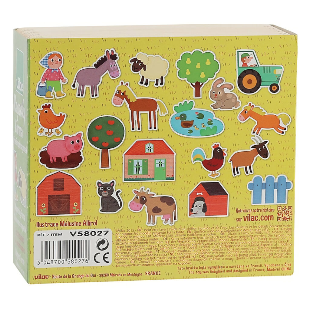 Sada dřevěných magnetek Vilac Farma přináší dětem 20 krásně ilustrovaných magnetů s motivy ze života na farmě. Najdou zde kravičku, ovečku, koně, prasátko, slepičku, traktor, farmáře i další prvky, které dohromady vytvářejí malý venkovský svět plný fantazie.