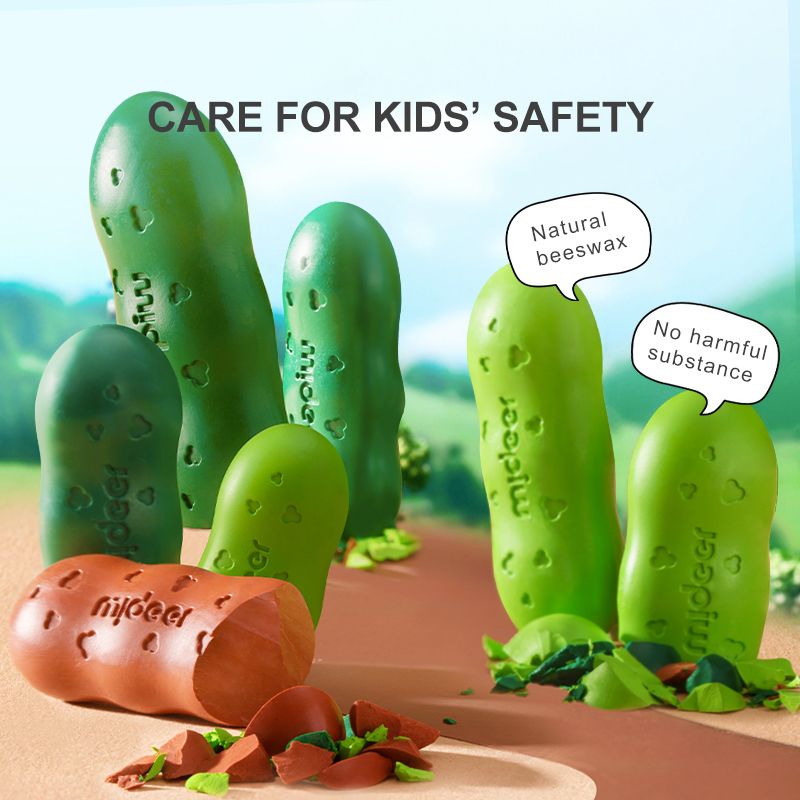 Vyznačují se ergonomickým tvarem, připomínajícím lusk hrášku, ideálně padnou do malých dětských ruček. Jsou zcela netoxické, snadno omyvatelné a bezpečné pro děti. Vyrobeny jsou z barevného pigmentu a přírodního včelího vosku.