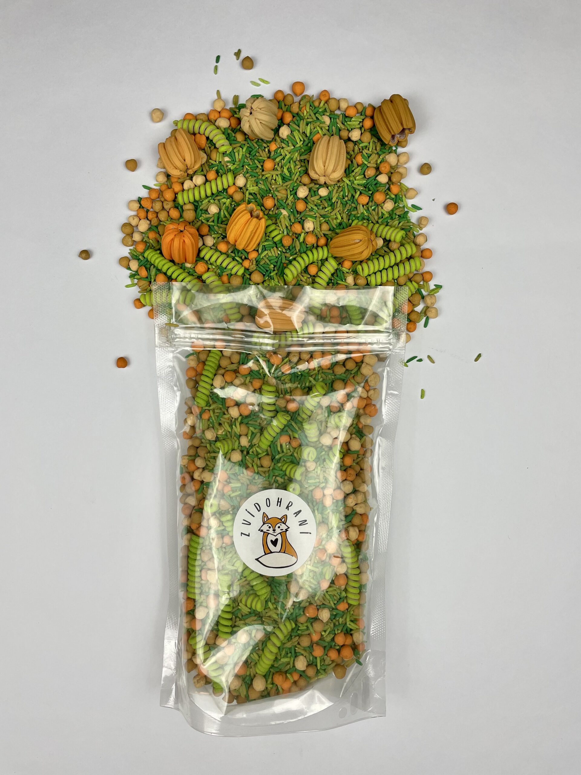 Podzim v krabici! Dýňobraní je pečlivě namíchaná senzorická směs s rýží v odstínech „usychající trávy“, tematickými těstovinami, barevnou cizrnou a fusilli, které svým tvarem připomenou dýňové krucánky. Děti mohou sypat, přelévat, přebírat, třídit barvy i tvary a vytvářet malé dýňové scenérie v misce či na senzorickém tácu. Směs je z přírodních materiálů, barvená netoxickými barvami a vyráběná v Česku. K dispozici je ve dvou velikostech balení (500 ml a 1100 ml).