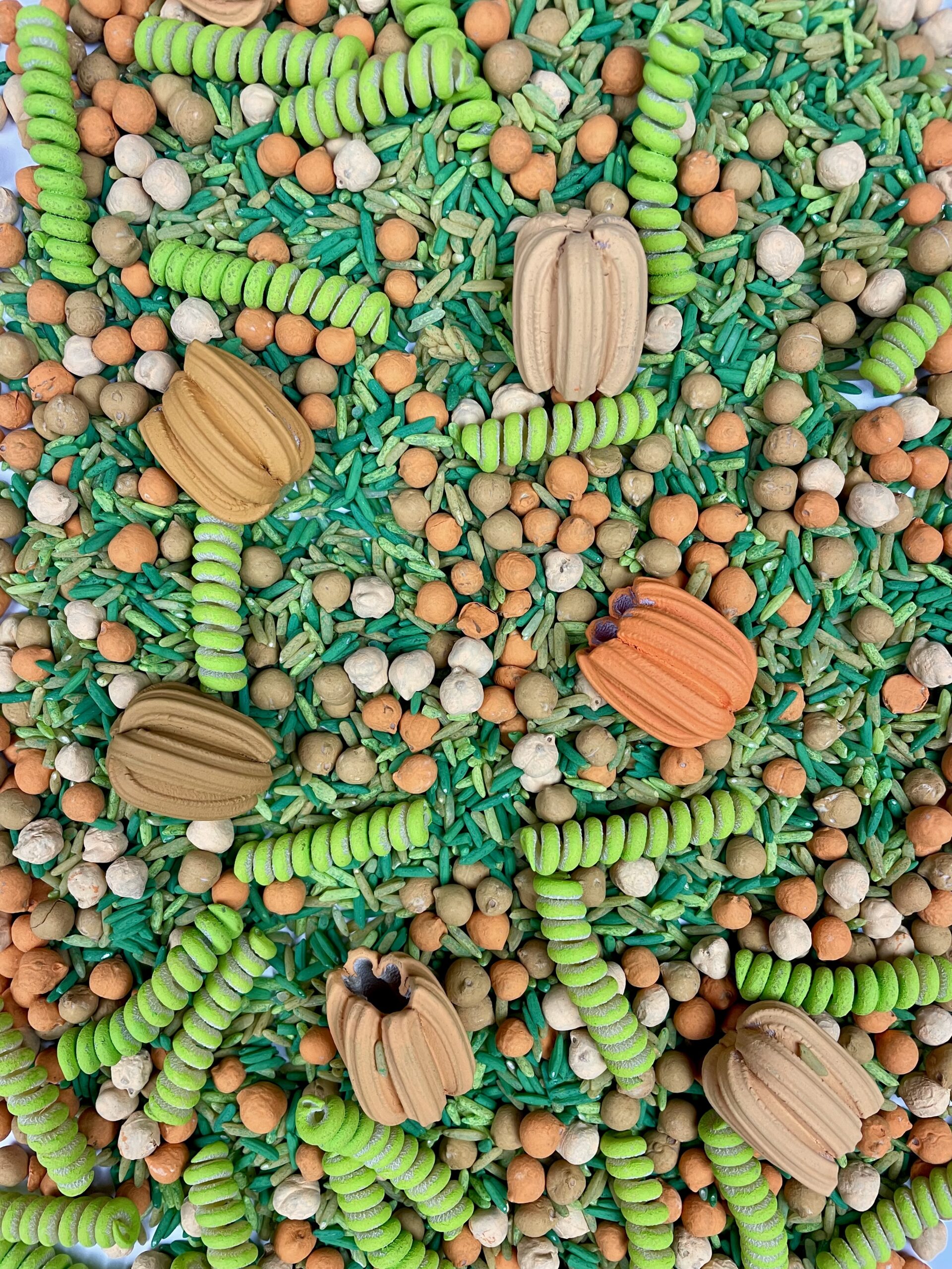 Rýže v několika odstínech zelené, která barvou připomíná usychající trávu. Těstoviny jedinečného tvaru, které jsou jako stvořené pro dýně a barevná cizrna v několika barvách. A nakonec fusilli, které připomínají dýňové krucánky. Pojďme sklízet!