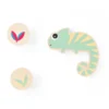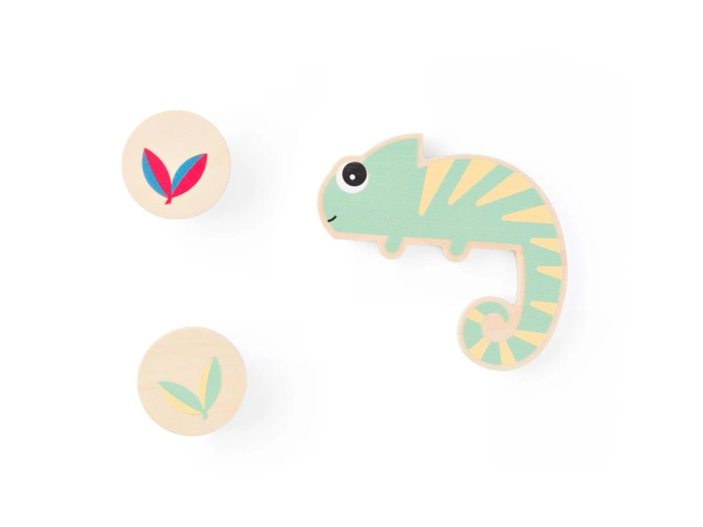 - Obsah hry: 10 dřevěných chameleonů (10,5 x 9,5 x 1 cm), 10 dřevěných žetonů s barevnými listy ( 4,5 x 4,5 x 2 cm).