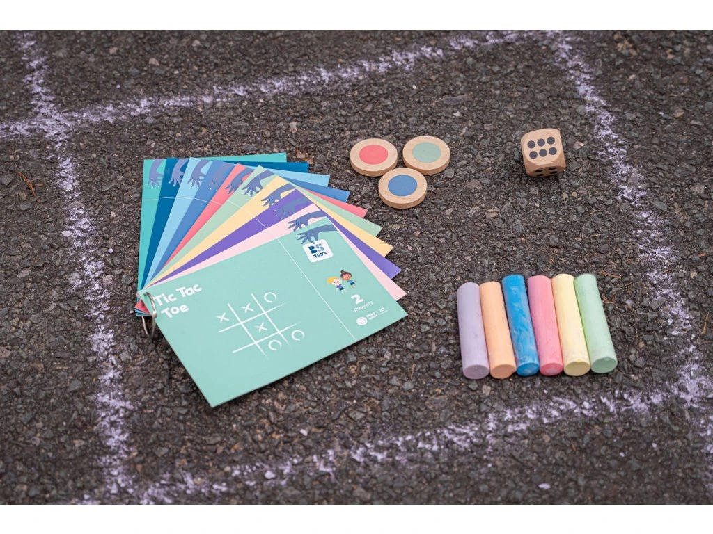 - Obsah balení: 6 kříd (10 × 2,5 cm), 1 hrací kostka (4 x 4 x 4 cm), 3 žetony 10 karet s úkoly