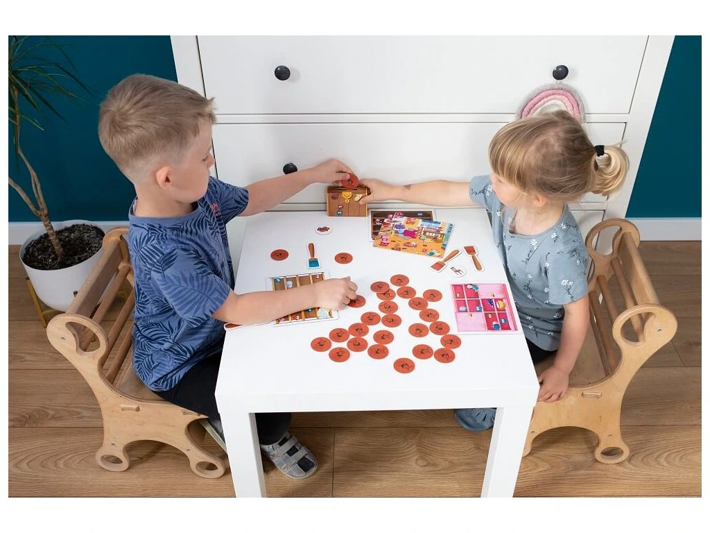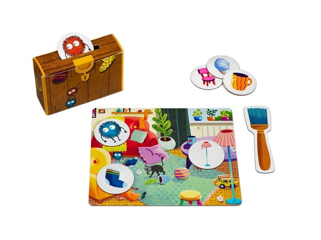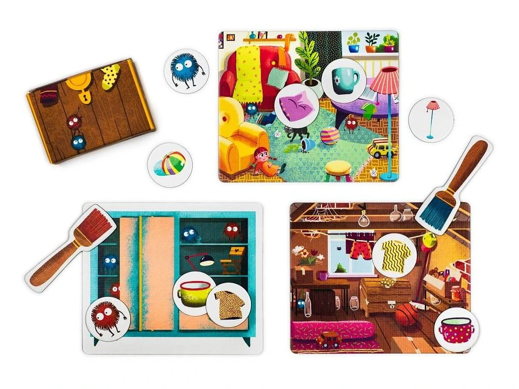 Pusťte se do úklidu jako nikdy předtím! Vaším úkolem je zastavit nezbedné prachové koule, než se dostanou k ponožkám, autům nebo panenkám. Děti se při hře učí třídit předměty podle barvy, velikosti nebo typu, a přitom si nenásilně procvičují paměť, postřeh a logické uvažování. Hra podporuje soustředění, rozvíjí koordinaci oko–ruka a přináší radost z dokončeného úkolu. Úklid už nemusí být nuda – může to být dobrodružství! Vhodné pro 1 až 4 hráče od 3 let, doba hry je 10–20 minut.
