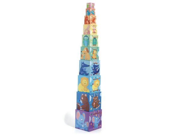 Děti baví stavět vysokánskou věž a zase ji bořit, vkládat kostky do sebe a postupně se učí základní počty, barvy, tvary, povídají si o vyobrazených zvířátkách.
