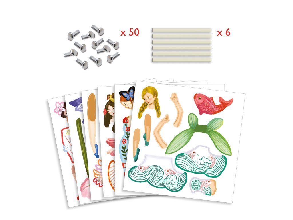 Sada obsahuje 6 archů s potištěnými postavami víl, 50 kovových spojek, 6 dřevěných tyček a barevný návod. Nejprve děti vybarví víly, potom je pomocí konektorů spojí a navléknou na tyčky, čímž vytvoří pohyblivé loutky vysoké přibližně 19 cm. Hotové figurky se hodí pro hraní i vystavení.