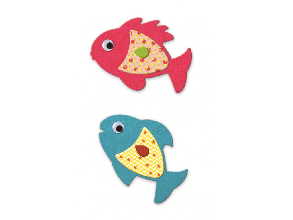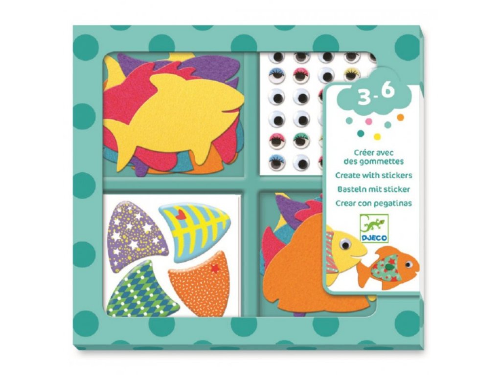 Set obsahuje 6 archů s vyobrazenými rybími šupinkami v podobě pestrobarevných kabátků, 2 archy s očíčkami a 24 rybiček, které děti dozdobí a doplní samolepkami.