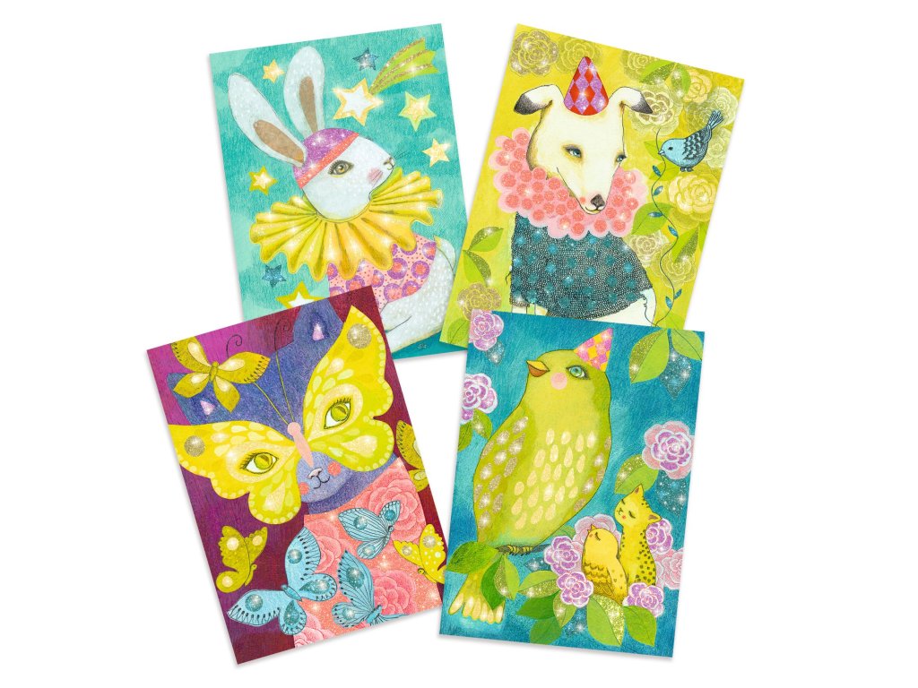 Pískování Zvířecí karneval. Veselá zvířátka z karnevalu k dotvoření pomocí třpytivých písků. Vysypte čtyři originální obrázky třpytkami a rozjasněte zvířátkům jejich karnevalový svět.