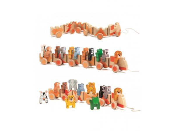 Zvířátka se naskládají na vláček s pěti vagónky a mašinkou, který děti za sebou tahají.