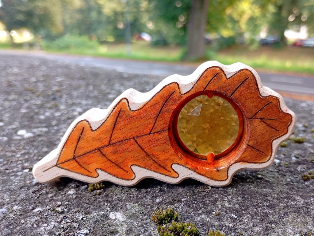 Síla a noblesa v jednom kousku. Zlaté „okénko“ v dubovém listu vytváří teplé odlesky, které děti fascinují při prosvěcování na okně i s baterkou. Tvar dubu přirozeně vede k poznávání stromů a sezónních témat. Pevné dřevěné tělo je odolné, dobře uchopitelné a vhodné pro samostatné zkoumání i společné aktivity. Elegantní design potěší i jako dekorace.