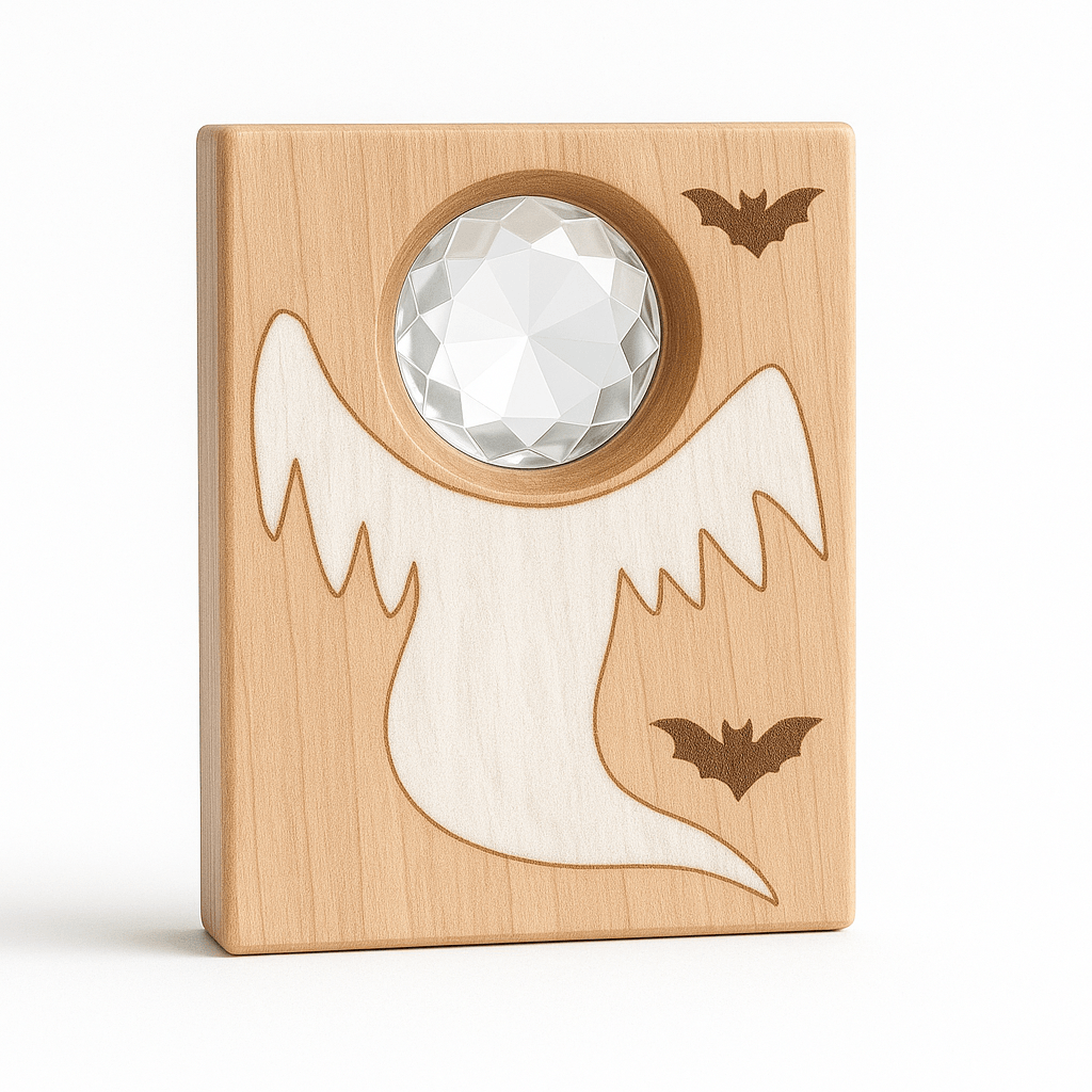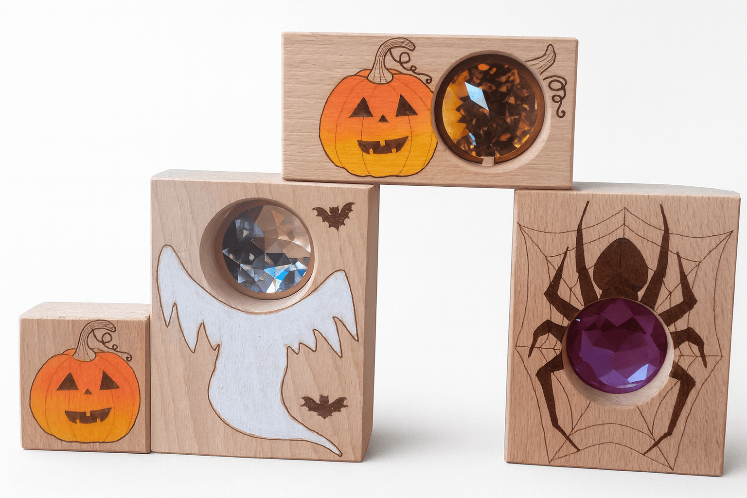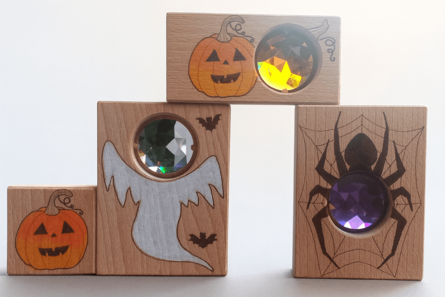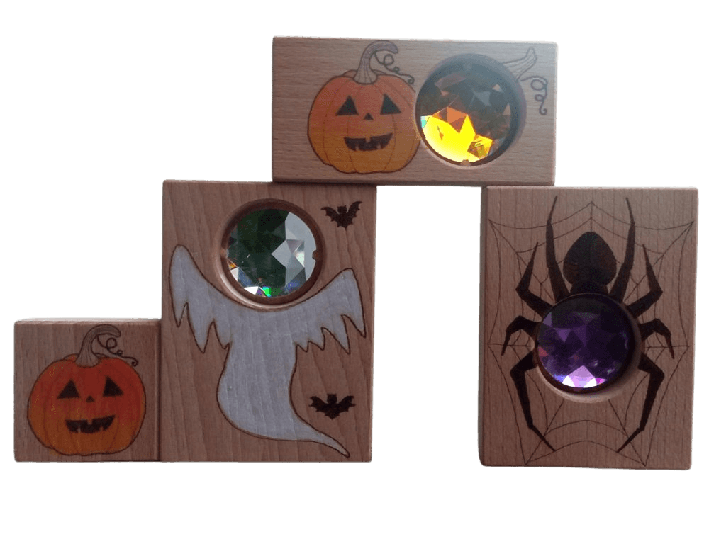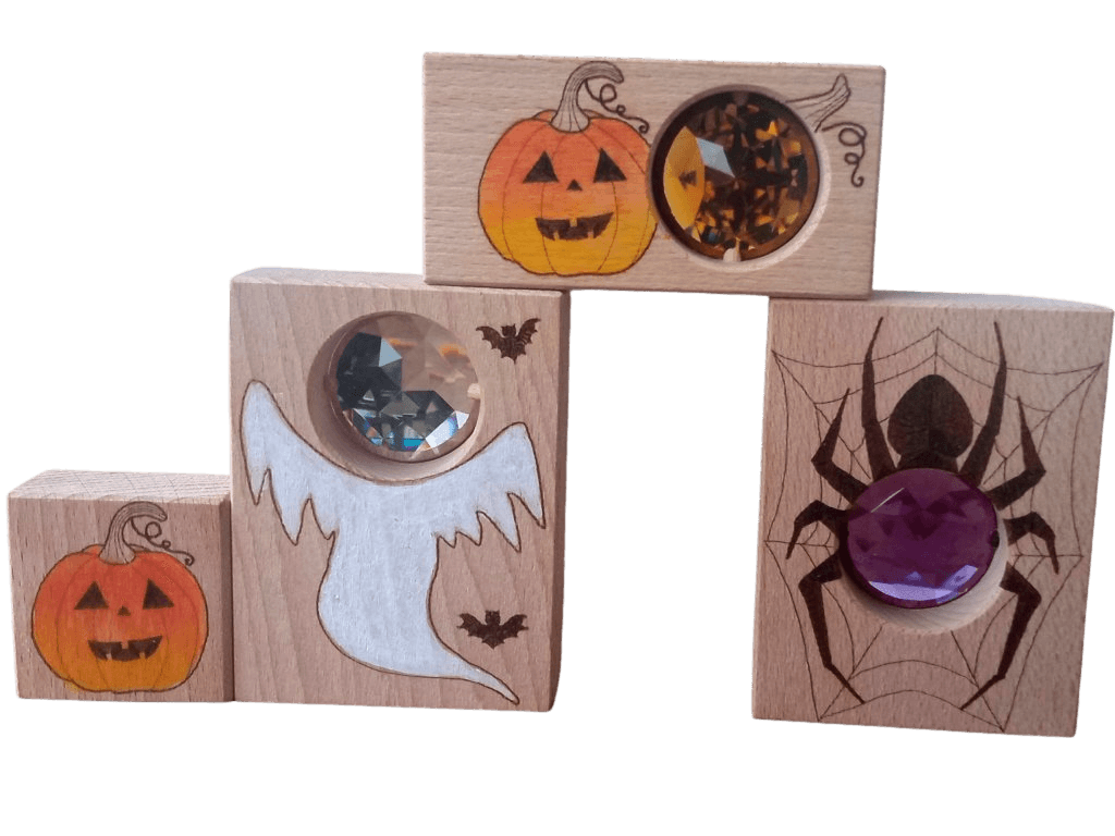 K podzimu patří světýlka, stíny a trocha „bububu“ – přesně to tahle limitovaná Halloween sada přináší do dětské hry i sezónní výzdoby. V balení najdeš tři kuk-kostky se sklíčky pro hru se světlem a jednu malovanou kostku navíc. Motivy? Fialový pavouček, zlatá dýně a bílý duch – zábavná trojka na tvoření miniscén, světelných pokusů a podzimních koutků. Kostky rozvíjejí otevřenou hru, smyslové vnímání, třídění a slovní zásobu (barvy, tvary, sezónní témata). Autorská práce z kvalitního dřeva zaručí příjemný dotyk i dlouhou životnost.