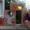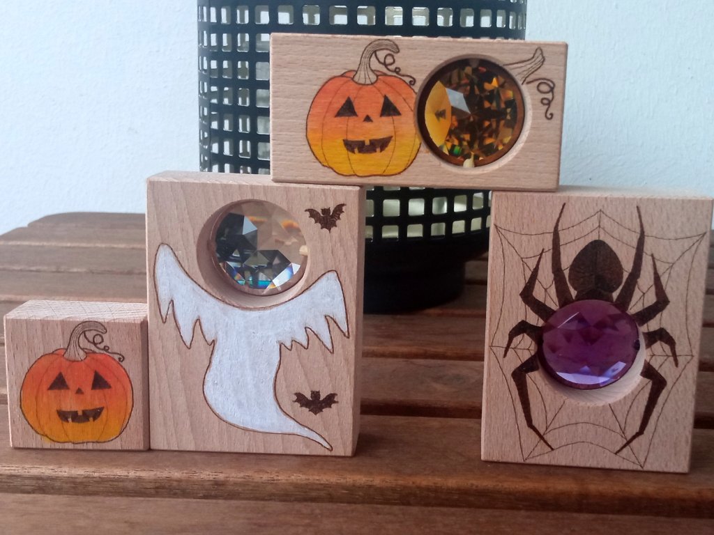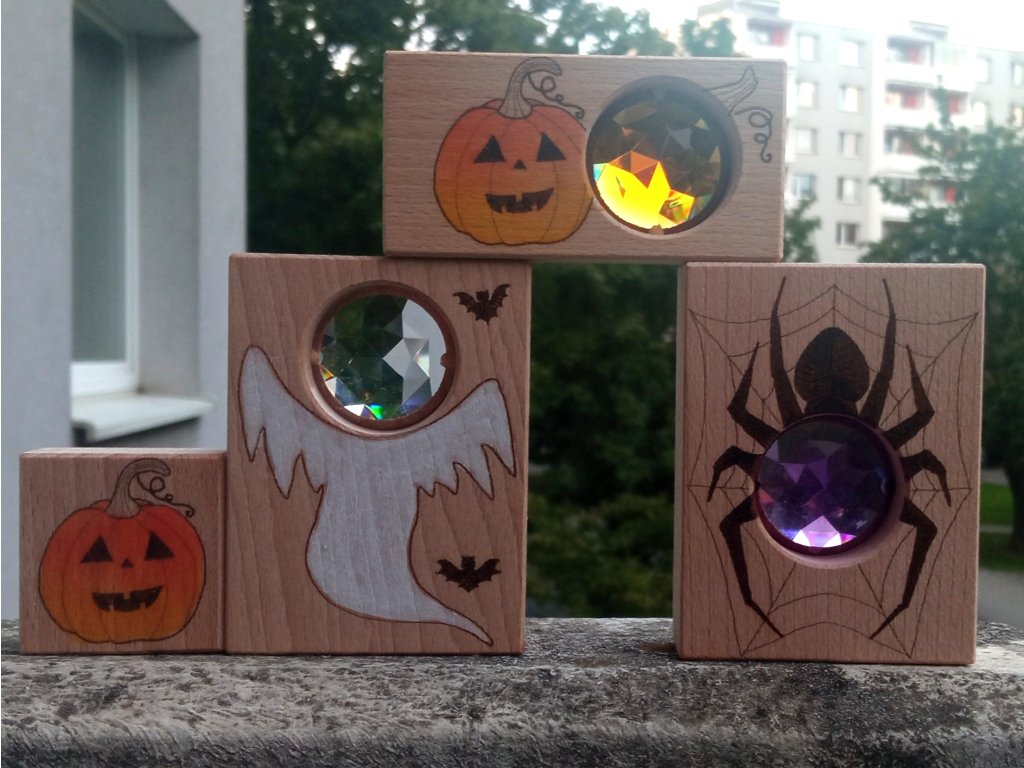 Dřevo z duhy – Halloween sada (3× kuk kostka + 1× malovaná)
