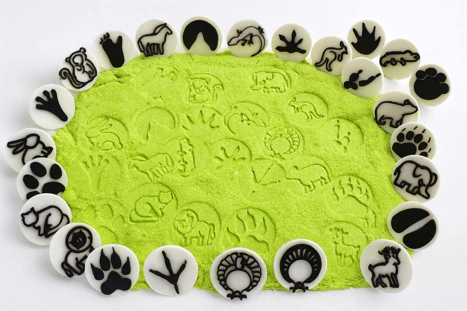 PLA razítka jsou lehká, ideálně velká a dobře se s nimi pracuje. Vyzkoušet můžete použití různé síly při obtiskování do modelíny či hlíny. Pokaždé tak můžete vytvořit jiné scény a vzorky na modelovací hmotě nebo v kinetickém písku.