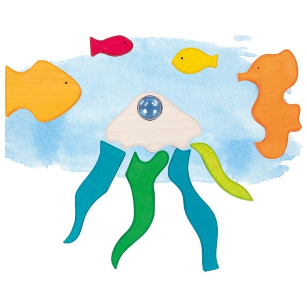 Díky použití vodou ředitelných barev v kombinaci se skleněnými kamínky odráží každý dílek světlo jako mořské světelné odlesky a zanechává na dřevě přirozenou kresbu . Sada je určena pro děti od 4 let a výhradně vyráběna v Evropě .