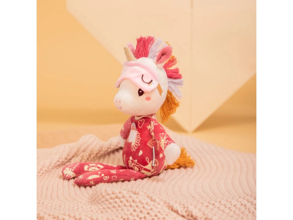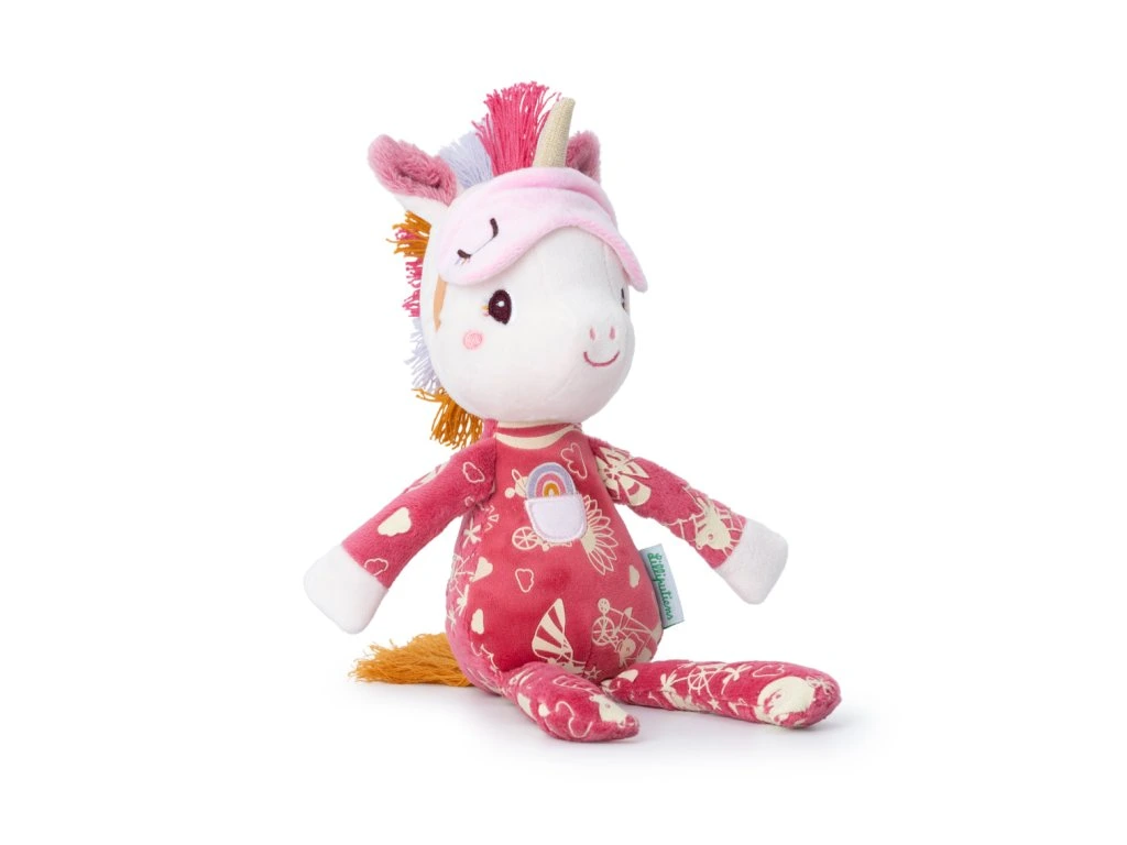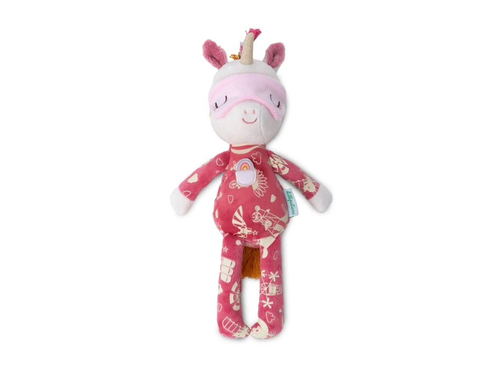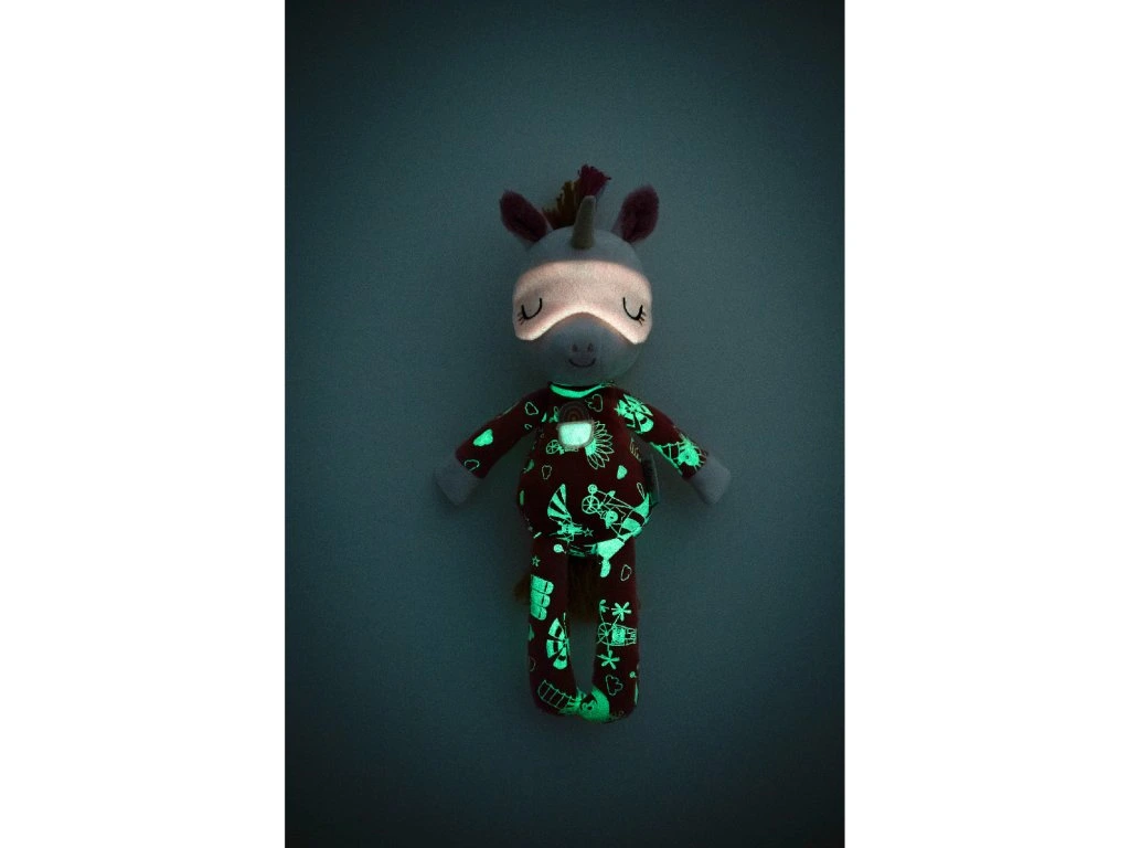 Heboučká parťačka na usínání, která vnese do večerního rituálu kousek kouzla. Lena – jednorožec má pyžamko s fosforeskujícími (svíticími) ilustracemi a spací masku, která se dá přetáhnout přes oči. Stačí ji před spaním nasvítit a potisky ve tmě jemně září – děti uklidní a dodají jim pocit bezpečí. Hračka je lehká, mazlivá a pratelná na 30 °C (jemný cyklus). Doporučeno od 6 měsíců.