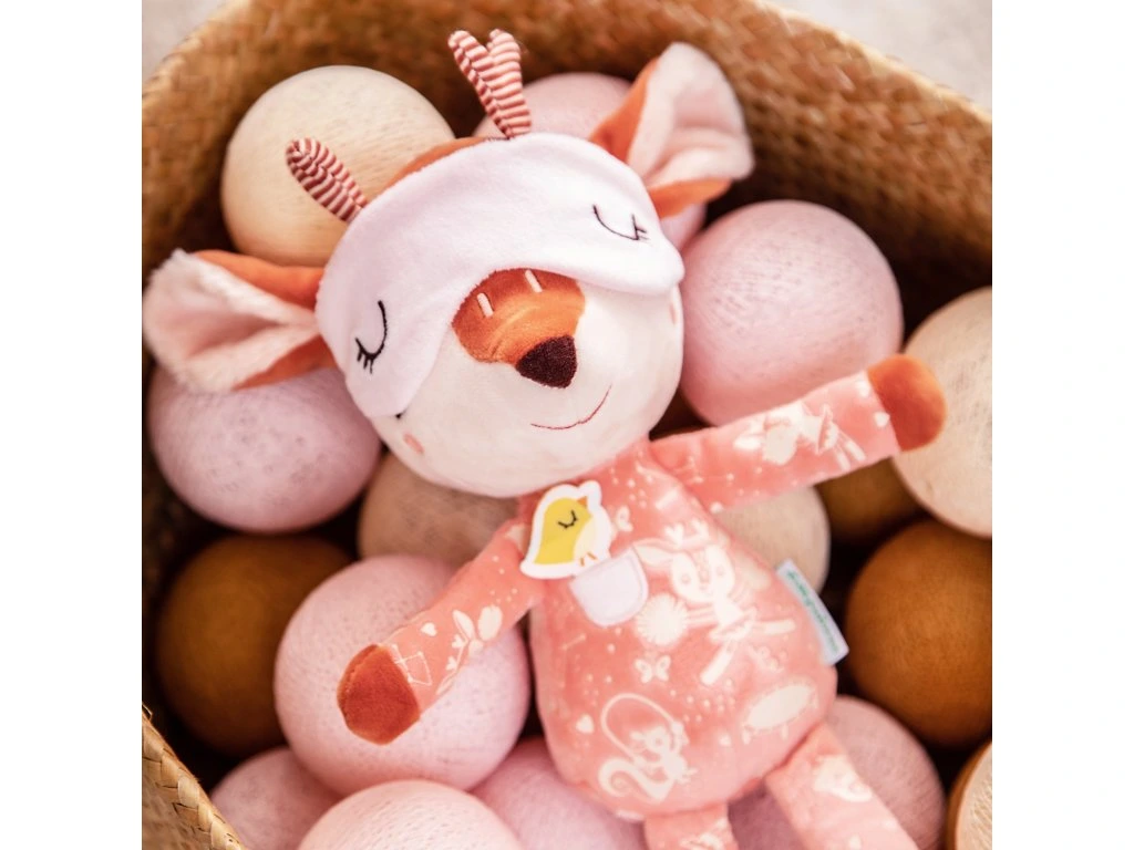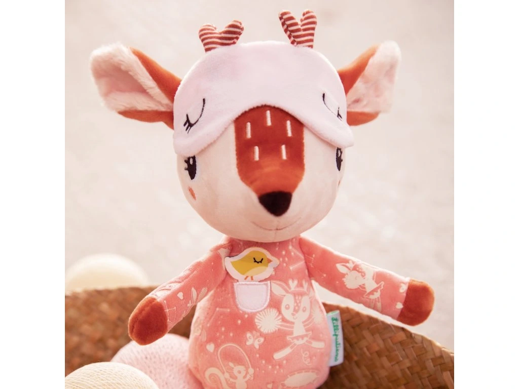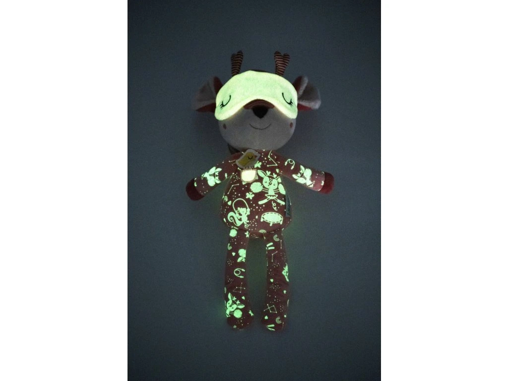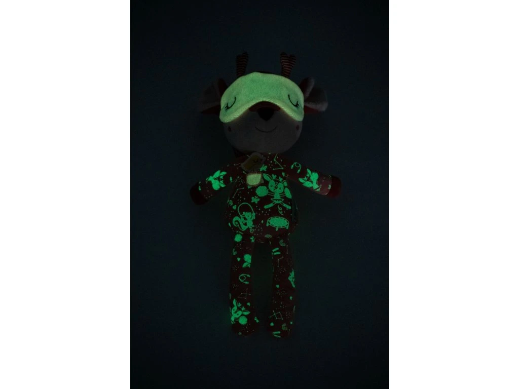 Heboučká parťačka na usínání se špetkou kouzel. Stella – jelínek má pyžámko a spací masku se svíticím (fosforeskujícím) potiskem: stačí je před spaním krátce nasvítit, a ve tmě pak jemně září a děti uklidní. Hračka je pratelná na 30 °C (jemný cyklus), takže večerní rituál zvládnete každý den bez starostí. Doporučeno zhruba od 6 měsíců.