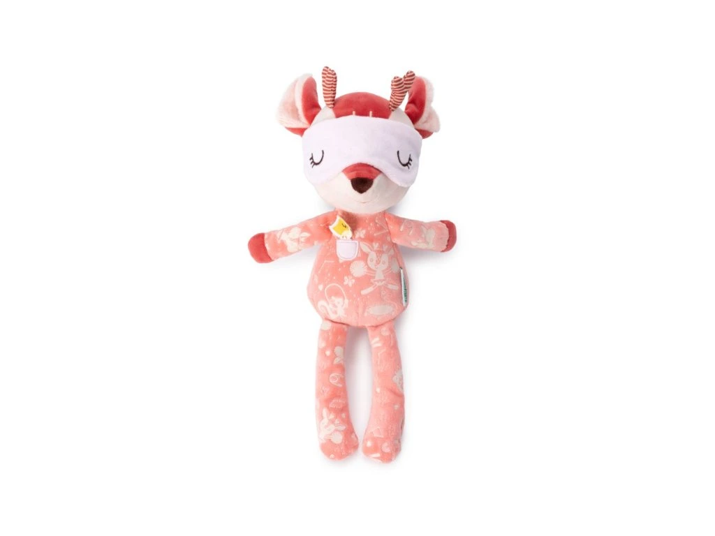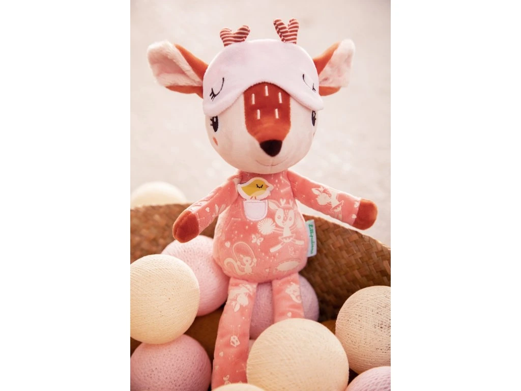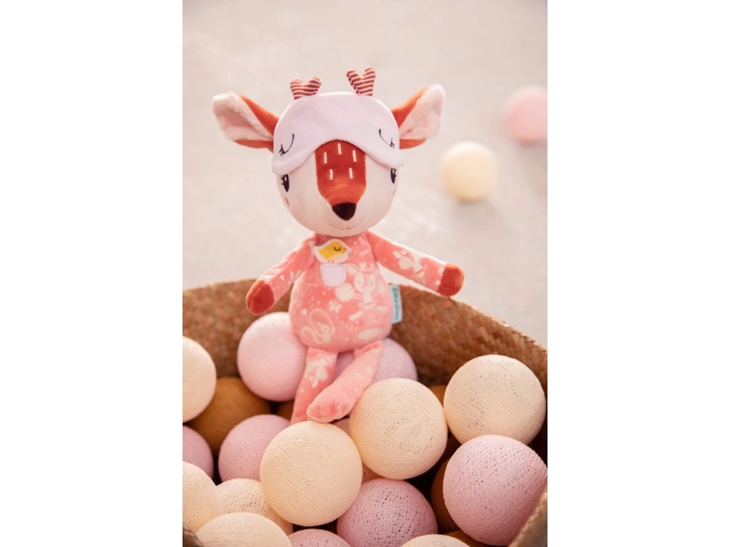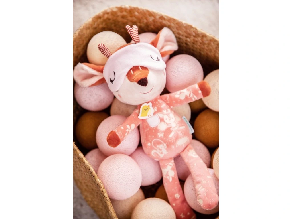Heboučká parťačka na usínání se špetkou kouzel. Stella – jelínek má pyžámko a spací masku se svíticím (fosforeskujícím) potiskem: stačí je před spaním krátce nasvítit, a ve tmě pak jemně září a děti uklidní. Hračka je pratelná na 30 °C (jemný cyklus), takže večerní rituál zvládnete každý den bez starostí. Doporučeno zhruba od 6 měsíců.