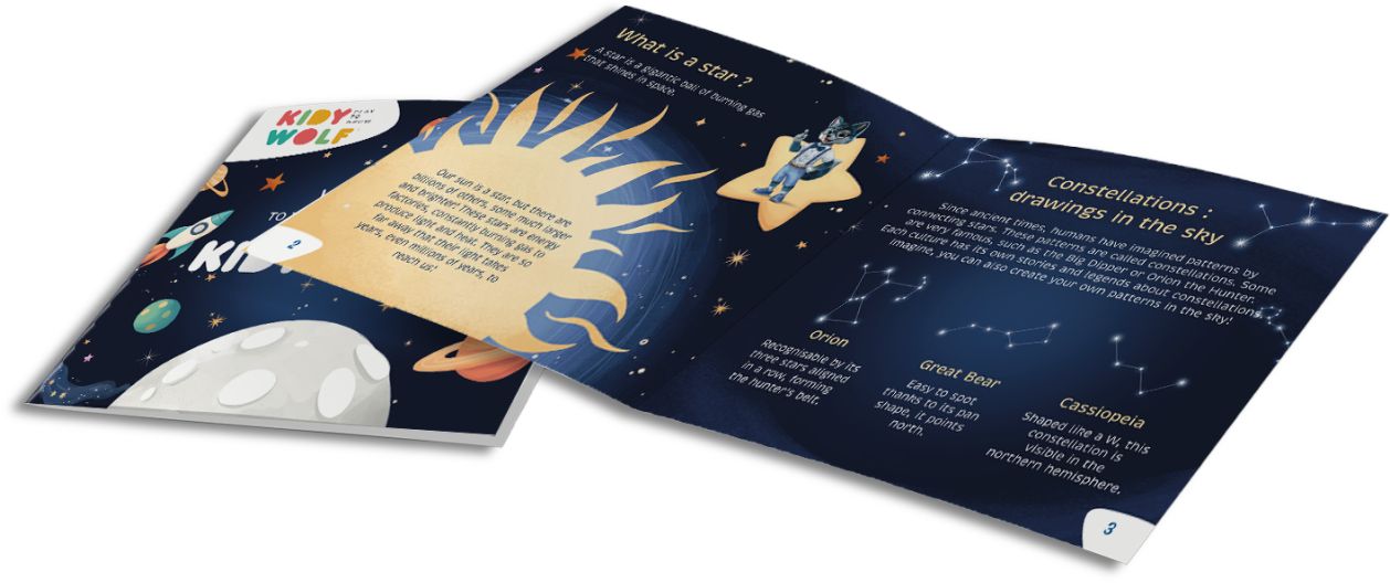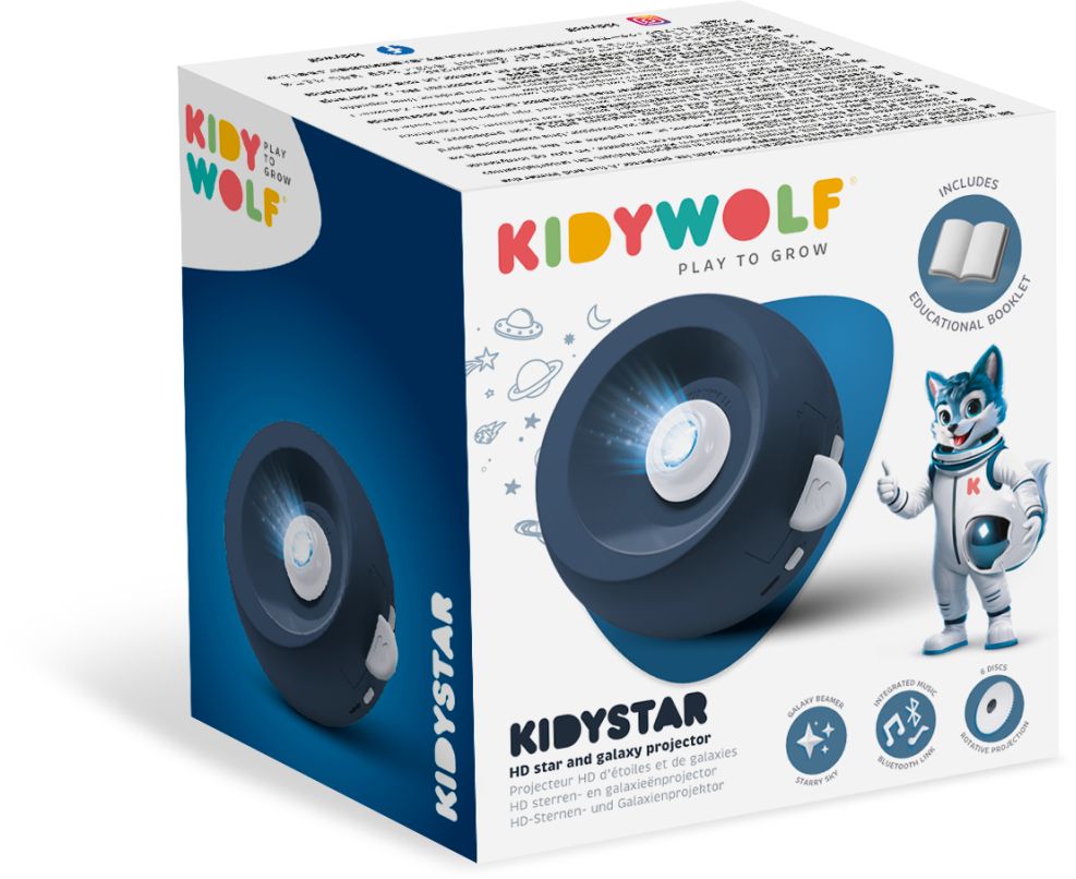 KIDYSTAR je magický obrazový projektor od značky Kidywolf, který promění strop a stěny dětského pokoje v kouzelnou galaxii plnou hvězd a vesmírných motivů – ideální pro večerní relaxaci a usínání. KIDYWOLF Projektor obsahuje 6 vyměnitelných projekčních disků, které nabízejí různé tematické obrazy, a rotační systém, díky kterému se světelné efekty plynule pohybují po místnosti.