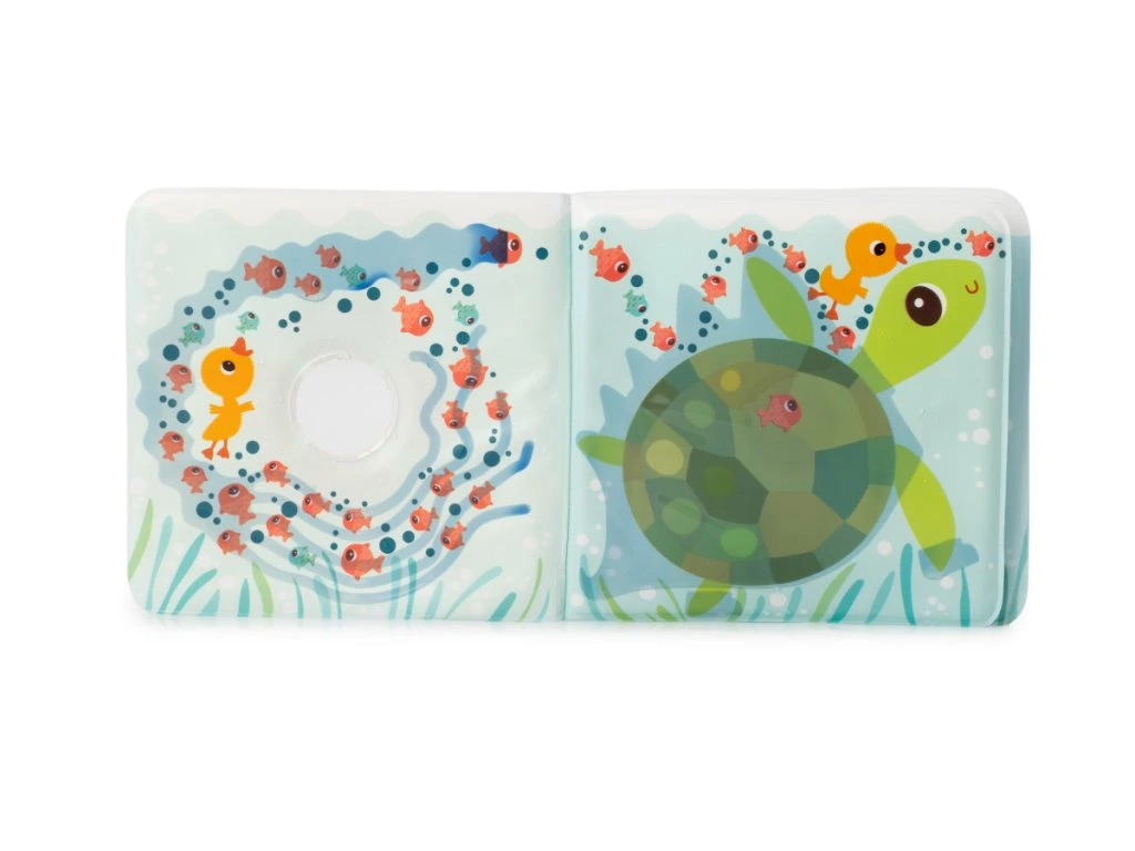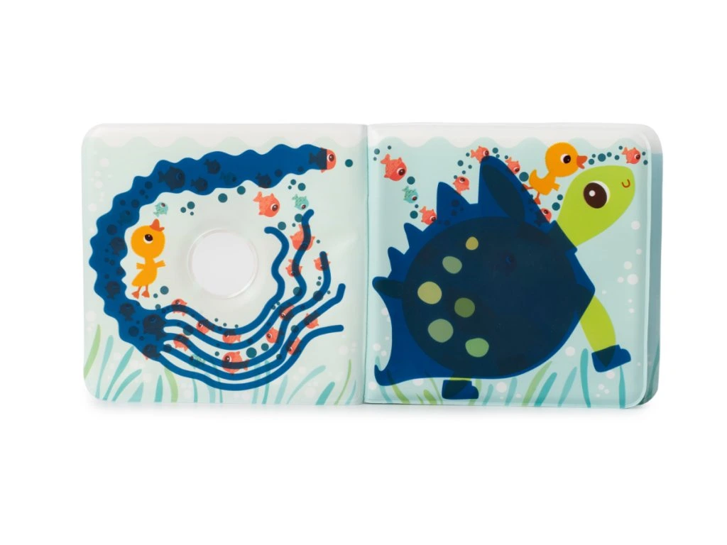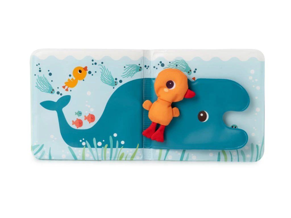 Naplňte vanu teplou vodou (≥ 32 °C), namočte knížku a nechte dítě objevovat „zmizející“ inkoust. Vezměte kačera Gasparda a proplujte s ním stránkami: „Koho potkáme? Želvu, nebo velrybu?“ Povídejte si o tom, co se stalo předtím a potom, napodobujte zvuky moře a vymýšlejte vlastní pokračování.