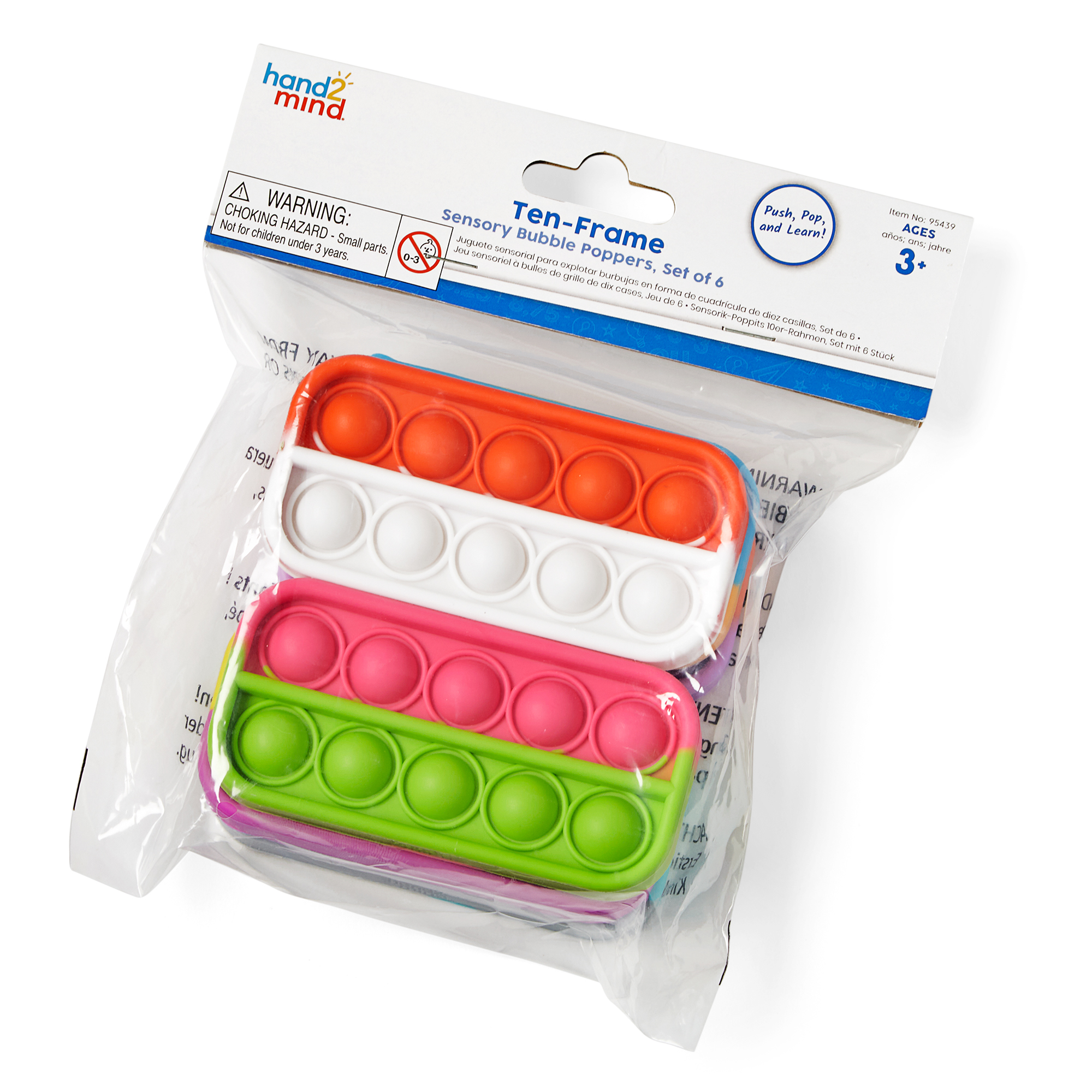 6 barevných senzorních ten-frame popperů – každý s bublinkami, které lze opakovaně stisknout a „popnout“ pro procvičování počítání a manipulaci. Poppery mají různé barevné kombinace.