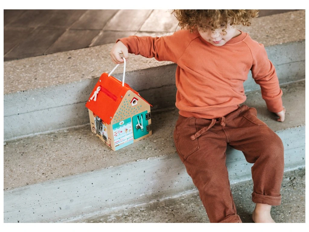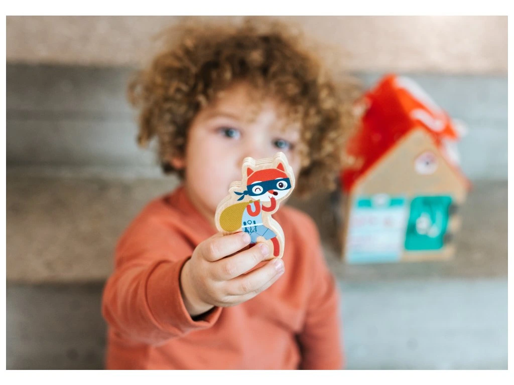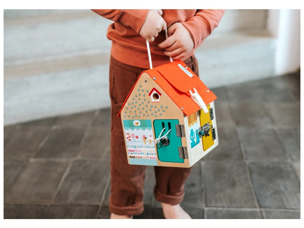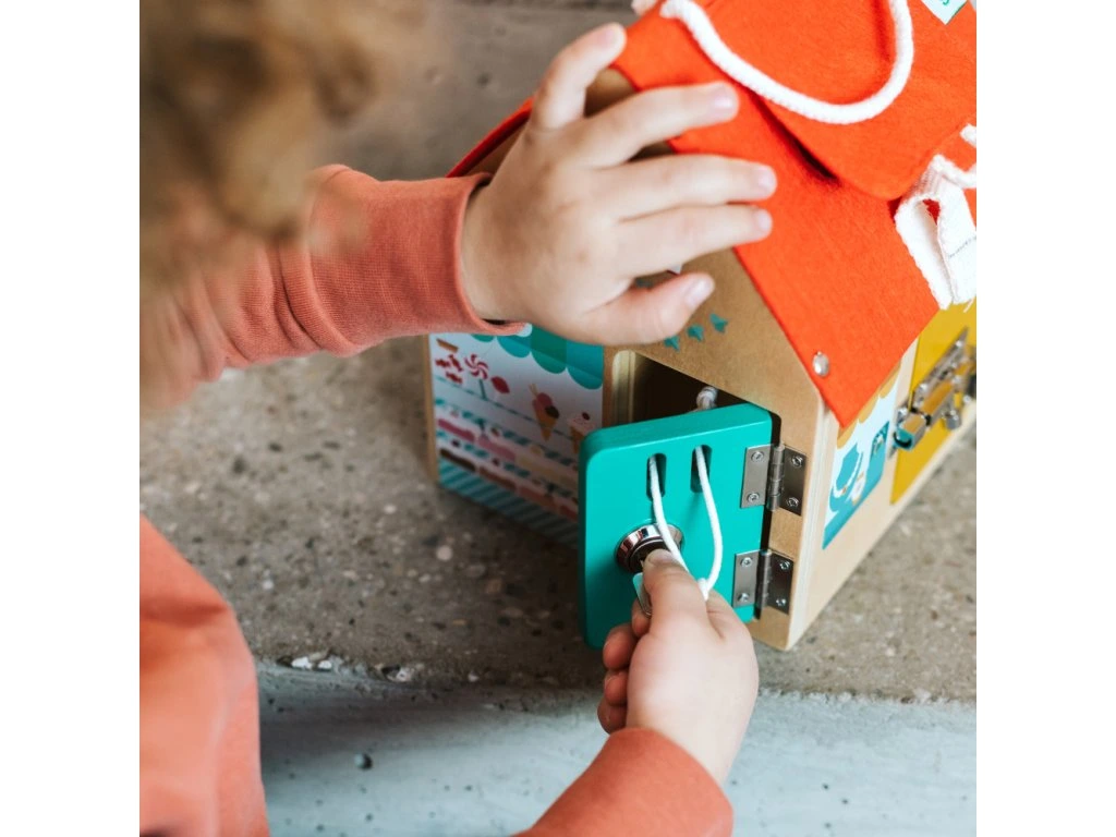 Pozor, někde se potuluje vychytralá liška – jsou všechna dvířka a okénka opravdu zamčená? Děti objevují 6 různých typů uzávěrů a trénují jemnou motoriku i logické uvažování: klíč, západka, posuvník, háček/klip, zip a suchý zip (na střeše). Krásně ilustrovaný domek s otevírací střechou láká k vyprávění příběhů a hře na „hlídače“ i „detektiva“. Vhodné od 3 let.