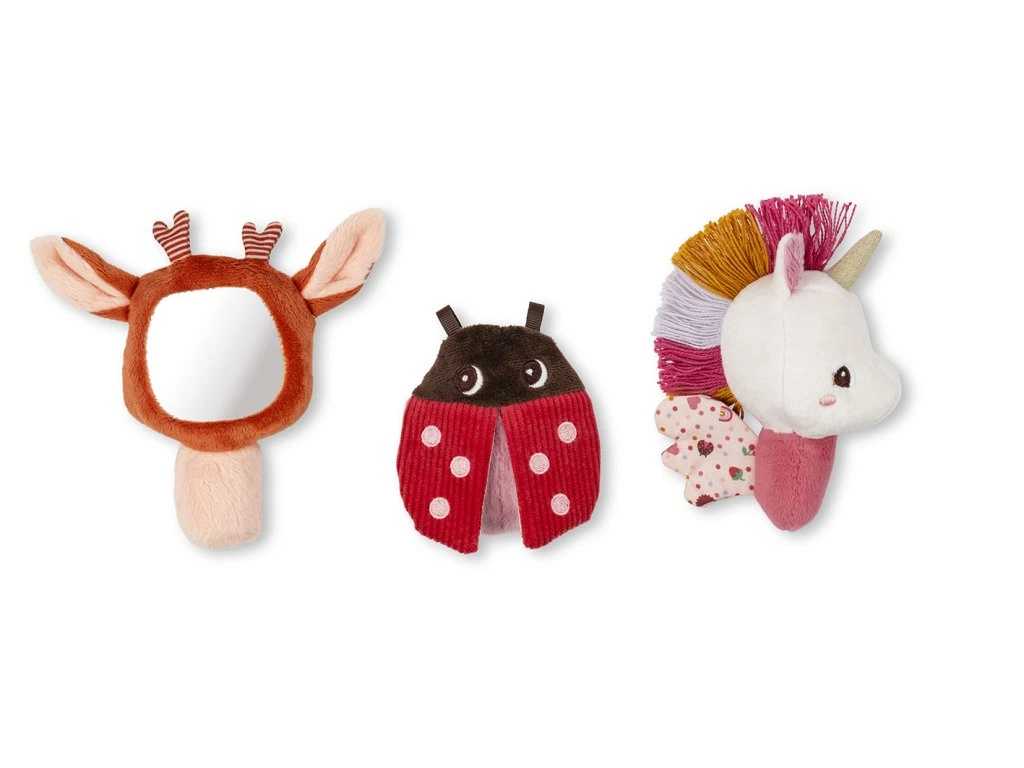 Sada nabízí různé typy textur a interaktivních prvků – od šustících částí přes různé látkové povrchy až po části určené ke zkoumání dotykem. Děti tak mohou objevovat kontrasty tvarů, materiálů a zvuků, které přirozeně podporují jejich rozvoj smyslů a soustředění. Veselý motiv jednorožce Leny dětem navíc přináší radost z hraní a podněcuje jejich představivost.